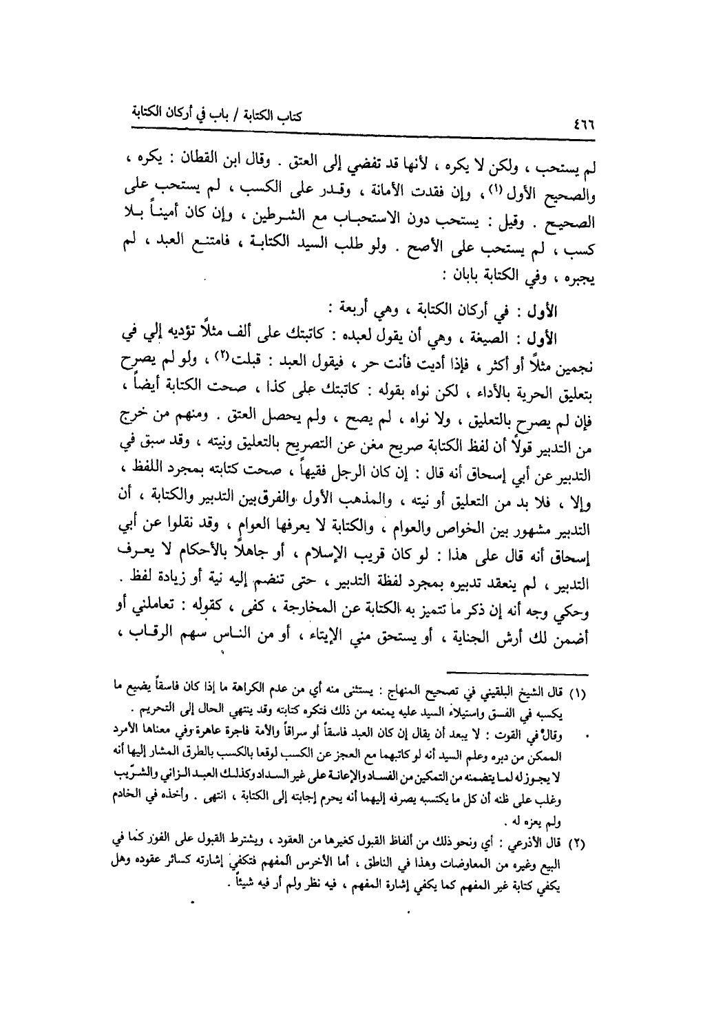 الأول: في أركان الكتابة، وهي أربعة: الاول: الصيغة، وهي أن يقول لعبده: كاتبتك على ألف مثلا تؤديه إلي في نجمين مثلا أو أكثر، فإذا أديت فأنت حر، فيقول العبد قبلت. ولو لم يصرح بتعليق الحرية بالاداء، لكن نواه بقوله: كاتبتك على كذا، صحت الكتابة أيضا، فإن لم يصرح بالتعليق، ولا نواه، لم يصح، ولم يحصل العتق. ومنهم من خرج من التدبير قولا ان لفظ الكتابة صريح مغن عن التصريح بالتعلق ونيته، وقد سبق في التدبير عن أبي إسحق أنه قال: إن كان الرجل فقيها، صحت كتابته بمجرد اللفظ، وإلا، فلا بد من التعليق أو نيته، والمذهب الاول والفرق بين التدبير والكتابة، أن التدبير مشهور بين الخواص والعوام، والكتابة لا يعرفها العوام، وقد نقلوا عن أبي إسحق أنه قال على هذا: لو كان قريب الاسلام، أو جاهلا بالاحكام لا يعرف التدبير، لم ينعقد تدبيره بمجرد لفظة التدبير، حتى تنضم إليه نية أو زيادة لفظ. وحكي وجه أنه إن ذكر ما تتميز به الكتابة عن المخارجة، كفى، كقوله: تعاملني أو أضمن لك أرش الجناية، أو يستحق مني الايتاء، أو من الناس سهم الرقاب،