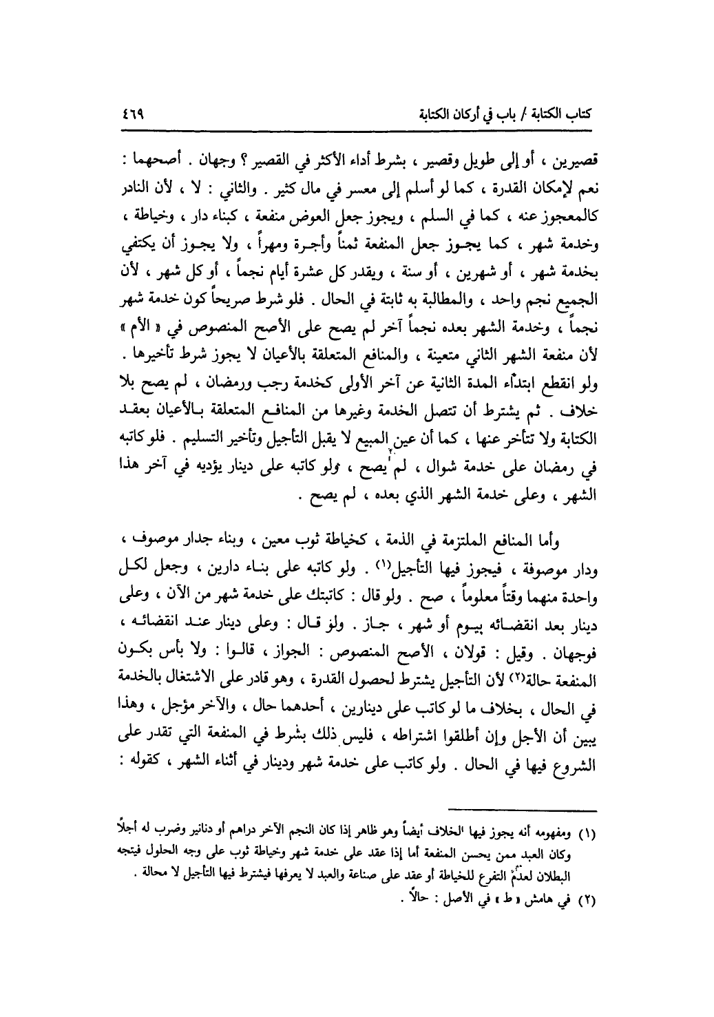 قصيرين، أو إلى طويل وقصير، بشرط أداء الاكثر في القصير ؟ وجهان. أصحهما: نعم لامكان القدرة، كما لو أسلم إلى معسر في مال كثير. والثاني: لا، لان النادر كالمعجوز عنه، كما في السلم، ويجوز جعل العوض منفعة، كبناء دار، وخياطة، وخدمة شهر، كما يجوز جعل المنفعة ثمنا وأجرة ومهرا، ولا يجوز أن يكتفى بخدمة شهر، أو شهرين، أو سنة، ويقدر كل عشرة أيام نجما، أو كل شهر، لان الجميع نجم واحد، والمطالبة به ثابتة في الحال. فلو شرط صريحا كون خدمة شهر نجما، وخدمة الشهر بعده نجما آخر، لم يصح على الاصح المنصوص في الام لان منفعة الشهر الثاني متعينة، والمنافع المتعلقة بالاعيان لا يجوز شرط تأخيرها. ولو انقطع ابتداء المدة الثانية عن آخر الاولى كخدمة رجب ورمضان، لم يصح بلا خلاف. ثم يشترط أن تتصل الخدمة وغيرها من المنافع المتعلقة بالاعيان بعقد الكتابة ولا تتأخر عنها، كما أن عين المبيع لا يقبل التأجيل وتأخير التسليم. فلو كاتبه في رمضان على خدمة شوال لم يصح، ولو كاتبه على دينار يؤديه في آخر هذا الشهر، وعلى خدمة الشهر الذبعده، لم يصح. وأما المنافع الملتزمة في الذمة، كخياطة ثوب معين، وبناء جدار موصوف، ودار موصوفة، فيجوز فيها التأجيل. ولو كاتبه على بناء دارين، وجعل لكل واحدة منهما وقتا معلوما، صح. ولو قال: كاتبتك على خدمة شهر من الآن، وعلى دينار بعد انقضائه بيوم أو شهر، جاز. ولو قال: وعلى دينار عند انقضائه، فوجهان. وقيل: قولان، الاصح المنصوص: الجواز، قالوا: ولا بأس بكون المنفعة حالة لان التأجيل يشترط لحصول القدرة، وهو قادر على الاشتغال بالخدمة في الحال، بخلاف ما لو كاتب على دينارين، أحدهما حال، والآخر مؤجل، وهذا يبين أن الاجل وإن أطلقوا اشتراطه، فليس ذلك بشرط في المنفعة التي تقدر على الشروع فيها في الحال. ولو كاتب على خدمة شهر ودينار في أثناء الشهر، كقوله: