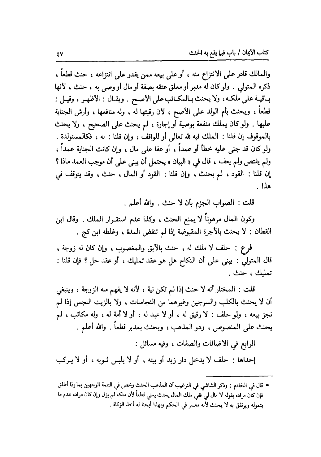 والمالك قادر على الانتنزاع منه، أو على بيعه ممن يقدر على انتزاعه، حنث قطعا، ذكره المتولي. ولو كان له مدبر أو معلق عتقه بصفة أو مال أو وصى به، حنث، لانها باقية على ملكه، ولا يحنث بالمكاتب على الاصح. ويقال: الاظهر، وقيل: قطعا، ويحنث بأم الولد على الاصح، لان رقبتها له، وله منافعها، وأرش الجناية عليها. ولو كان يملك منفعة بوصية أو إجارة، لم يحنث على الصحيح، ولا يحنث بالموقوف إن قلنا: الملك فيه لله تعالى أو للواقف، وإن قلنا: له، فكالمستولدة. ولو كان قد جنى عليه خطأ أو عمدا، أو عفا على مال، حنث، وإن كانت الجناية عمدا، ولم يقتص ولم يعف، قال في البيان يحتمل أن يبنى على أن موجب العمد ماذا ؟ إن قلنا: القود، لم يحنث، وإن قلنا: القود أو المال، حنث، وقد يتوقف في هذا. قلت: الصواب الجزم بأن لا حنث. والله أعلم. وكون المال مرهونا لا يمنع الحنث، وكذا عدم استقرار الملك. وقال ابن القطان: لا يحنث بالاجرة المقبوضة إذا لم تنقض المدة، وغلطه ابن كج. فرع حلف لا ملك له، حنث بالآبق والمغصوب، وإن كان له زوجة، قال المتولي: يبنى على أن النكاح هل هو عقد تمليك، أو عقد حل ؟ فإن قلنا: تمليك، حنث. قلت: المختار أنه لا حنث إذا لم تكن نية، لانه لا يفهم منه الزوجة، وينبغي أن لا يحنث بالكلب والسرجين وغيرهما من النجاسات، ولا بالزيت النجس إذا لم نجز بيعه. ولو حلف: لا رقيق له، أو لا عبد له، أو لاأمة له، وله مكاتب، لم يحنث على المنصوص، وهو المذهب، ويحنث بمدبر قطعا. والله أعلم.