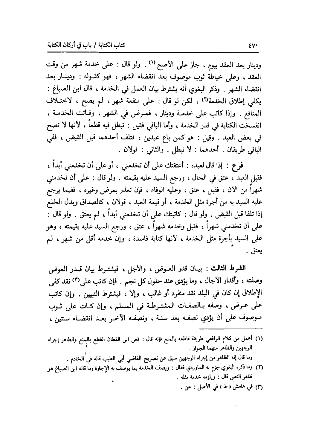 ودينار بعد العقد بيوم، جاز على الاصح. ولو قال: على خدمة شهر من وقت العقد، وعلى خياطة ثوب موصوف بعد انقضاء الشهر، فهو كقوله: ودينار بعد انقضاء الشهر. وذكر البغوي أنه يشترط بيان العمل في الخدمة، قال ابن الصباغ: يكفي إطلاق الخدمة، لكن لو قال: على منفعة شهر، لم يصح، لاختلاف المنافع. وإذا كاتب على خدمة ودينار، فمرض في الشهر، وفاتت الخدمة، انفسخت الكتابة في قدر الخدمة، وأما الباقي فقيل: تبطل فيه قطعا، لانها لا تصح في بعض العبد. وقيل: هو كمن باع عبدين، فتلف أحدهما قبل القبض، ففي الباقي طريقان. أحدهما: لا تبطل. والثاني: قولان. فرع إذا قال لعبده: أعتقتك على أن تخدمني، أو على أن تخدمني أبدا، فقبل العبد، عتق في الحال، ورجع السيد عليه بقيمته. ولو قال: على أن تخدمني شهرا من الآن، فقبل، عتق، وعليه الوفاء، فإن تعذر بمرض وغيره، ففيما يرجع عليه السيد به من أجرة مثل الخدمة، أو قيمة العبد قولان، كالصداق وبدل الخلع إذا تلفا قبل القبض. ولو قال: كاتبتك على أن تخدمني أبدا، لم يعتق. ولو قال: على أن تخدمني شهرا، فقبل وخدمه شهرا، عتق، ورجع السيد عليه بقيمته، وهو على السيد بأجرة مثل الخدمة، لانها كتابة فاسد، وإن خدمه أقل من شهر، لم يعتق. الشرط الثالث: بيان قدر العوض، والاجل فيشترط بيان قدر العوض وصفته، وأقدار الآجال، وما يؤدى عند حلول كل نجم. فإن كاتب على نقد كفى الاطلاق إن كان في البلد نقد منفرد أو غالب، وإلا، فيشترط التبيين. وإن كاتب على عرض، وصفه بالصفات المشترطة في المسلم، وإن كاتب على ثوب موصوف على أن يؤدي نصفه بعد سنة، ونصفه بعد سنة، ونصفه الآخر بعد انقضاء سنتين،