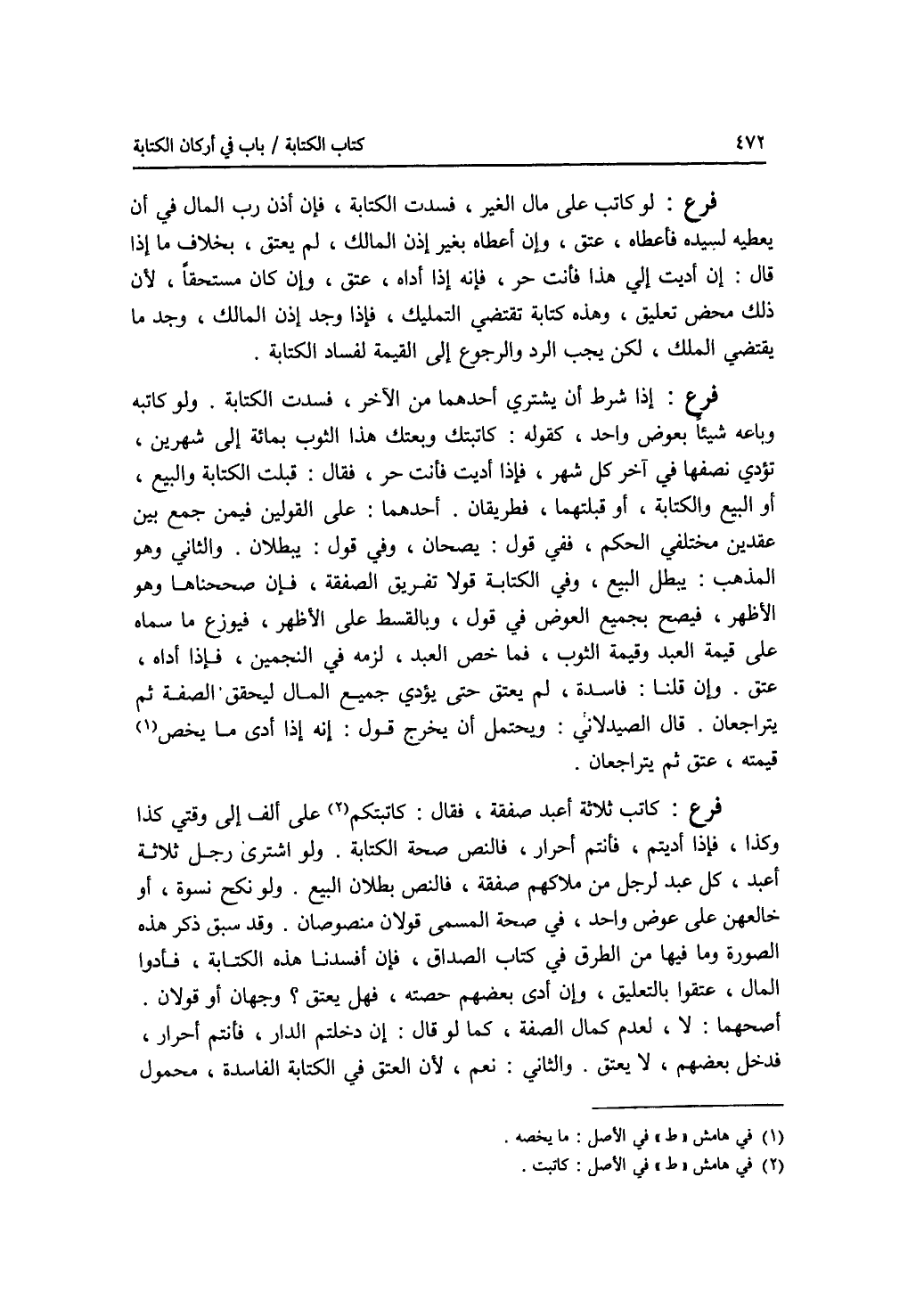 فرع لو كاتب على مال الغير، فسدت الكتابة، فإن أذن رب المال في أن يعطيه لسيده فأعطاه، عتق، وإن أعطاه بغير إذن المالك، لم يعتق، بخلاف ما إذا قال: إن أديت إلي هذا فأنت حر، فإنه إذا أداه، عتق، وإن كان مستحقا، لان ذلك محض تعليق، وهذه كتابة تقتضي التمليك، فإذا وجد إذن المالك، وجد ما يقتضي الملك، لكن يجب الرد والرجوع إلى القيمة لفساد الكتابة. فرع إذا شرط أن يشتري أحدهما من الآخر، فسدت الكتابة. ولو كاتبه وباعه شيئا بعوض واحد، كقوله: كاتبتك وبعتك هذا الثوب بمائة إلى شهرين، تؤدي نصفها في آخر كل شهر، فإذا أديت فأنت حر، فقال: قبلت الكتابة والبيع، أو البيع والكتابة، أو قبلتهما، فطريقان. أحدهما: على القولين فيمن جمع بين عقدين مختلفي الحكم، ففي قول: يصحان، وفي قول: يبطلان. والثاني وهو المذهب: يبطل البيع، وفي الكتابة قولا تفريق الصفقة، فإن صححناها وهو الاظهر، فيصح بجميع العوض في قول، وبالقسط على الاظهر، فيوزع ما سماه على قيمة العبد وقيمة الثوب، فما خص العبد، لزمه في النجمين، فإذا أداه، عتق. وإن قلنا: فاسدة، لم يعتق حتى يؤدي جميع المال ليحقق الصفة ثم يتراجعان. قال الصيدلاني: ويحتمل أن يخرج قول: انه إذا أدى ما يخص قيمته، عتق ثم يتراجعان. فرع كاتب ثلاثة أعبد صفقة، فقال: كاتبتكم على ألف إلى وقتي كذا وكذا، فإذا أديتم، فأنتم أحرار، فالنص صحة الكتابة. ولو اشترى رجل ثلاثة أعبد، كل لرجل عبد من ملاكهم صفقة، فالنص بطلان البيع. ولو نكح نسوة، أو خالعهن على عوض واحد، ففي صحة المسمى قولان منصوصان. وقد سبق ذكر هذه الصورة وما فيها من الطرق في كتاب الصداق، فإن أفسدنا هذه الكتابة، فأدوا المال، عتقوا بالتعليق، وإن أد بعضهم حصته، فهل يعتق ؟ وجهان أو قولان. أصحهما: لا، لعدم كمال الصفة، كما لو قال: إن دخلتم الدار، فأنتم أحرار، فدخل بعضهم، لا يعتق. والثاني: نعم، لا العتق في الكتابة الفاسدة، محمول