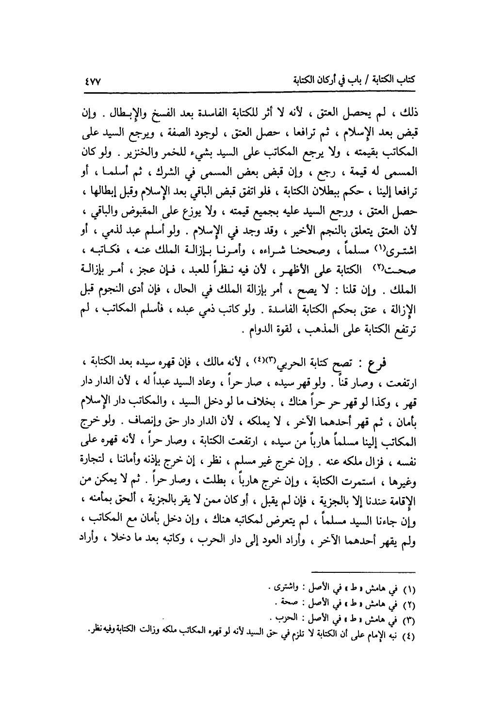 ذلك، لم يحصل العتق، لانه لا أثر للكتابة الفاسدة بعد الفسخ والابطال. وإن قبض بعد الاسلام، ثم ترافعا، حصل العتق، لوجود الصفة، ويرجع السيد على المكاتب بقيمته، ولا يرجع المكاتب على السيد بشئ للخمر والخنزير. ولو كان المسمى له قيمة، رجع وإن قبض بعض المسمى في الشرك، ثم أسلما، أو ترافعا إلينا، حكم ببطلان الكتابة، فلو اتفق قبض الباقي بعد الاسلام وقبل إبطالها، حصل العتق، ورجع السيد عليه بجميع قيمته، ولا يوزع على المقبوض والباقي، لان العتق يتعلق بالنجم الاخير، وقد وجد في الاسلام. ولو أسلم عبد لذمى، أو اشترى مسلما، وصححنا شراءه، وأمرنا بإزالة الملك عنه، فكاتبه، صحت الكتابة على الاظهر، لان فيه نظرا للعبد، فإن عجز، أمر بإزالة الملك. وإن قلنا: لا يصح، أمر بإزالة الملك في الحال، فإن أدى النجوم قبل الازالة، عتق بحكم الكتابة الفاسدة. ولو كاتب ذمي عبده، فأسلم المكاتب، لم ترتفع الكتابة على المذهب، لقوة الدوام. فرع تصح كتابة الحربي، لانه مالك، فإن قهره سيده بعد الكتابة، ارتفعت، وصار قنا. ولو قهر سيده، صار حرا، وعاد السيد عبدا له، لان الدار دار قهر، وكذا لو قهر حر حرا هناك، بخلاف ما لو دخل السيد، والمكاتب دار الاسلام بأمان، ثم قهر أحدهما الآخر، لا يملكه، لان الدار دار حق وإنصاف. ولو خرج المكاتب إلينا مسلما هاربا من سيده، ارتفعت الكتابة، وصار حرا، لانه قهره على نفسه، فزال ملكه عنه. وإن خرج غير مسلم، نظر، إن خرج بإذنه وأماننا، لتجارة، وغيرها، استمرت الكتابة، وإن خرج هاربا، بطلت، وصار حرا. ثم لا يمكن من الاقامة عندنا إلا بالجزية، فإن لم يقبل، أو كان ممن لا يقر بالجزية، ألحق بمأمنه، وإن جاءنا السيد مسلما، لم يتعرض لمكاتبه هناك، وإن دخل بأمان مع المكاتب، ولم يقهر أحدهما الآخر، وأراد العود إلى دار الحرب، وكاتبه بعد ما دخلا، وأراد