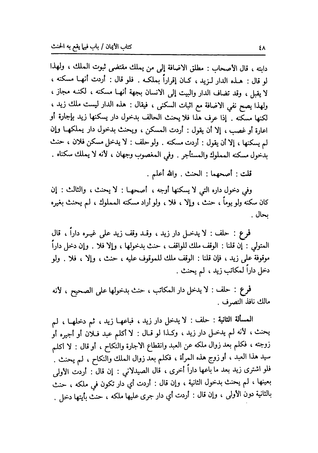 دابته، قال الاصحاب: مطلق الاضافة إلى من يملك مقتضى ثبوت الملك، ولهذا لو قال: هذه الدار لزيد، كان إقرارا بملكه. فلو قال: أردت أنها مسكنه، لا يقبل، وقد تضاف الدار والبيت إلى الانسان بجهة أنها مسكنه، لكنه مجاز، ولهذا يصح نفي الاضافة مع إثبات السكنى، فيقال: هذه الدار ليست ملك زيد، لكنها مسكنه. إذا عرف هذا فلا يحنث الحالف بدخول دار يسكنها زيد بإجارة أو إعارة أو غصب، إلا أن يقول أردت المسكن، ويحنث بدخول دار يملكها وإن لم يسكنها، إلا أن يقول: أرد ت مسكنه. ولو حلف: لا يدخل مسكن فلان، حنث بدخول مسكنه المملوك والمستأجر. وفي المغصوب وجهان، لانه لا يملك سكناه. قلت: أصحهما: الحنث. والله أعلم. وفي دخول داره التي لا يسكنها أوجه، أصحهما: لا يحنث، والثالث: إن كان سكنه ولو يوما، حنث، وإلا، فلا، ولو أراد مسكنه المملوك، لم يحنث بغيره بحال. فرع حلف: لا يدخل دار زيد، وقد وقف زيد على غيره دارا، قال المتولي: إن قلنا: الوقف ملك للواقف، حنث بدخولها، وإلا فلا. وإن دخل دارا موقوفة على زيد، فإن قلنا: الوقف ملك للموقوف عليه، حنث، وإلا، فلا. ولو دخل دارا لمكاتب زيد، لم يحنث. فرع حلف: لا يدخل دار المكاتب، حنث بدخولها على الصحيح، لانه مالك نافذ التصرف. المسألة الثانية: حلف: لا يدخل دار زيد، فباعها زيد، ثم دخلها، لم يحنث، لانه لم يدخل دار زيد، وكذا لو قال: لاأكلم عبد فلان أو أجيره أو زوجته، فكلم بعد زوال ملكه عن العبد وانقطاع الاجارة والنكاح، أو قال: لا أكلم سيد هذا العبد، أو زوج هذه ا المرأة، فكلم بعد زوال الملك والنكاح، لم يحنث. فلو اشترى زيد بعد ما باعها دارا أخرى، قال الصيدلاني: إن قال: أردت الاولى بعينها، لم يحنث بدخول الثانية، وإن قال: أردت أي دار تكون في ملكه، حنث بالثانية دون الاولى، وإن قال: أردت أي دار جرى عليها ملكه، حنث بأيتها دخل.