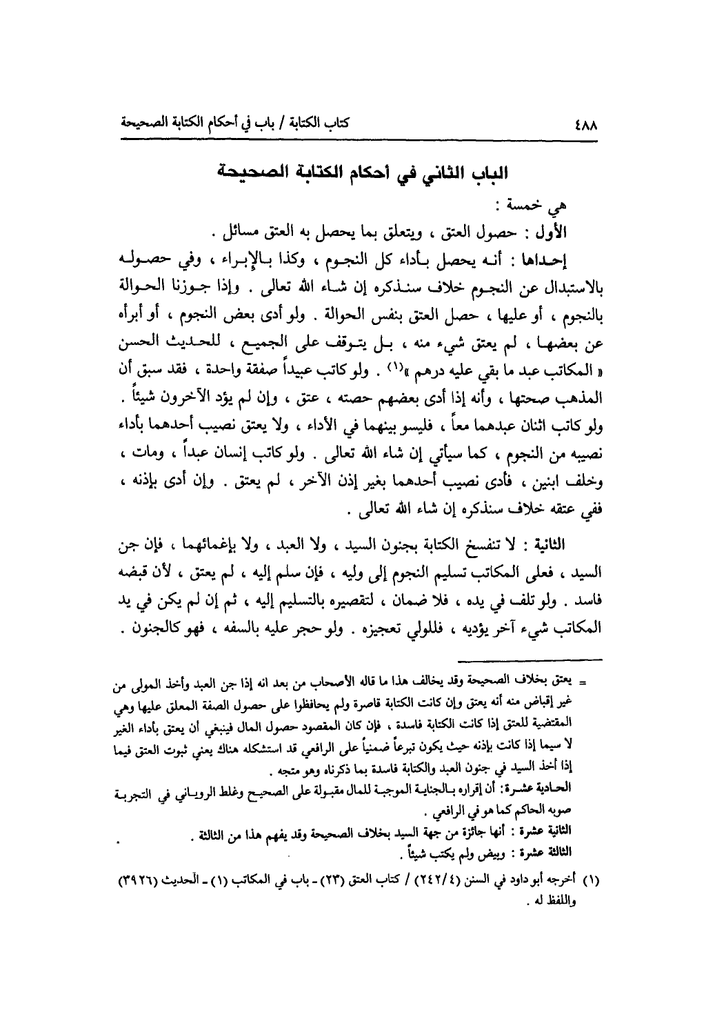 الباب الثاني : في أحكام الكتابة الصحيحة هي خمسة: الاول: حصول العتق، ويتعلق بما يحصل به العتق مسائل. إحداها: أنه يحصل بأداء كل النجوم، وكذا بالابراء، وفي حصوله بالاستبدال عن النجوم خلاف سنذكره إن شاء الله تعالى. وإذا جوزنا الحوالة بالنجوم، أو عليها، حصل العتق بنفس الحوالة. ولو أدى بعض النجوم، أو أبرأه عن بعضها، لم يعتق شئ منه، بل يتوقف على الجميع، للحديب الحسن المكاتب عبدما بقي عليه درهم. ولو كاتب عبيدا صفقة واحدة، فقد سبق أن المذهب صحتها، وأنه إذا أدى بعضهم حصته، عتق، وإن لم يؤد الآخرون شيئا. ولو كاتب اثنان عبدهما معا، فليسو بينهما في الاداء، ولا يعتق نصيب أحدهما بأداء نصيب أحدهما بأداج نصيبه من النجوم، كما سيأتي إن شاء الله تعالى. ولو كاتب إنسان عبدا، ومات، وخلف ابنين، فأدى نصيب أحدهما بغير إذن الآخر، لم يعتق. وإن أدى بإذنه، ففي عتقه خلاف سنذكره إن شاء الله تعالى. الثانية: لا تنفسخ الكتابة بجنون السيد، ولا العبد، ولا بإغمائهما، فإن جن السيد، فعلى المكاتب تسليم النجوم إلى وليه، فإن سلم إليه، لم يعتق، لان قبضه فاسد. ولو تلف في يده، فلا ضمان، لتقصيره بالتسليم إليه، ثم إن لم يكن في يد المكاتب شئ آخر يؤديه، فللولي تعجيزه. ولو حجر عليه بالسفه، فهو كالجنون.