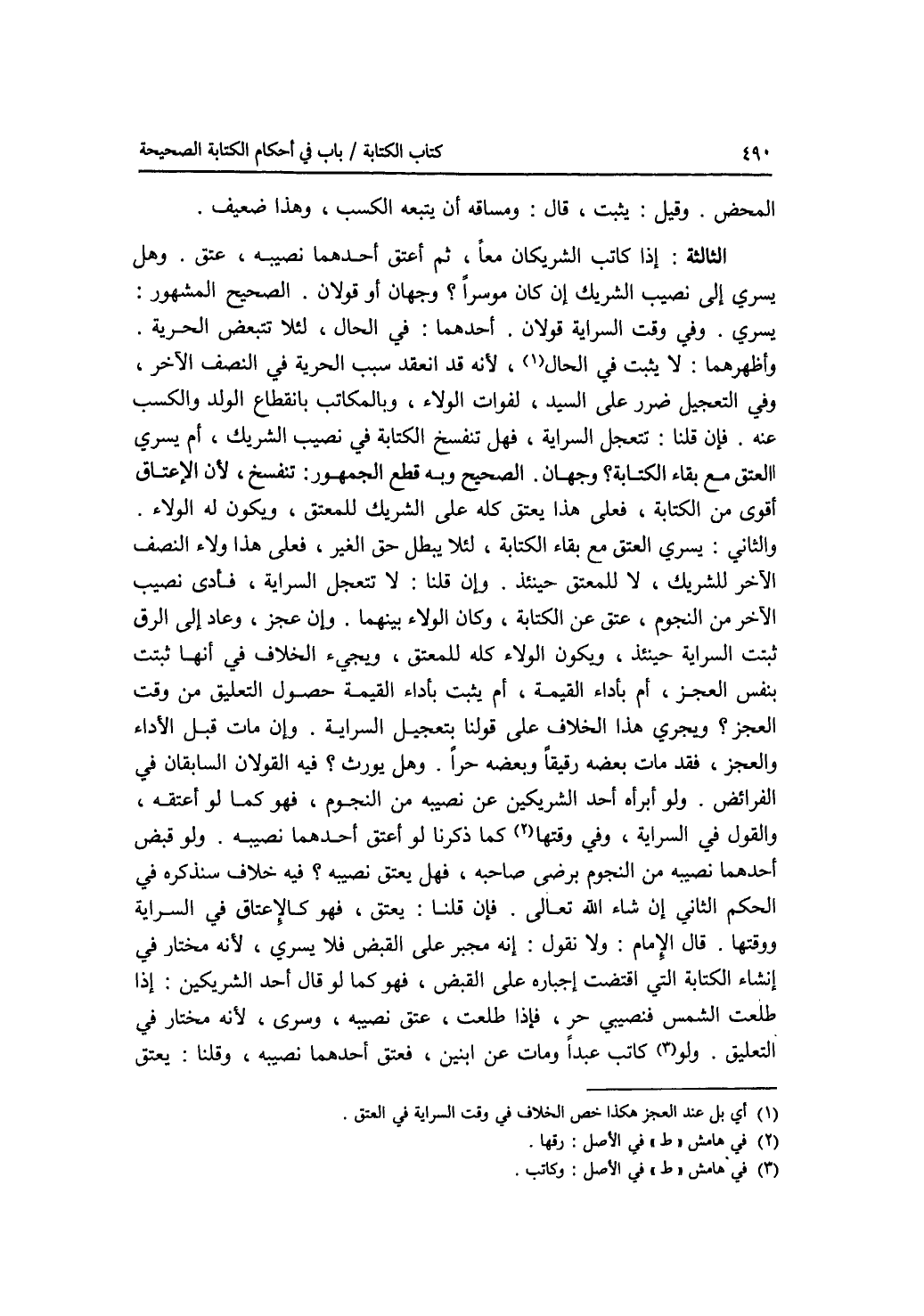 المحض. وقيل يثبت، قال: ومساقه أن يتبعه الكسب، وهذا ضعيف. الثالثة: إذا كاتب الشريكان معا، ثم أعتق أحدهما نصيبه، عتق. وهل يسري إلى نصيب الشريك إن كان موسرا ؟ وجهان أو قولان. الصحيح المشهور: يسري. وفي وقت السراية قولان. أحدهما: في الحال لئلا تتبعض الحرية. وأظهرهما: لا يثبت في الحال، لانه قد انعقد سبب الحرية في النصف الآخر، وفي التعجيل ضرر على السيد، لفوات الولاء، وبالمكاتب بانقطاع الولد والكسب عنه. فإن قلنا: تتعجل السراية، فهل تنفسخ الكتابة في نصيب الشريك، أم يسري العتق مع بقاء الكتابة ؟ وجهان. الصحيح وبه قطع الجمهور: تنفسخ، لان الاعتاق أقوى من الكتابة، فعلى هذا يعتق كله على الشريك للمعتق، ويكون له الولاء. والثاني: يسري العتق مع بقاء الكتابة، لئلا يبطل حق الغير، فعلى هذا ولاء النصف الآخر للشريك، لا للمعتق حينئذ. وإن قلنا: لا تتعجل السراية، فأدى نصيب الآخر من النجوم، عتق عن الكتابة، وكان الولاء بينهما. وإن عجز، وعاد إلى الرق ثبتت السراية حينئذ، ويكون الولاء كله للمعتق، ويجئ الخلاف في أنها ثبتت بنفس العجز، أم بأداء القيمة، أم يثبت بأداء القيمة حصول التعليق من وقت العجز ؟ ويجري هذا الخلاف على قولنا بتعجيل السراية. وإن مات قبل الاداء والعجز، فقد مات بعضه رقيقا وبعضه حرا. وهل يورث ؟ فيه القولان السابقان في الفرائض. ولو أبرأه أحد الشريكين عن نصيبه من النجوم، فهو كما لو أعتقه، والقول في السراية، وفي وقتها كما ذكرنا لو أعتق أحدهما نصيبه. ولو قبض أحدهما نصيبه من النجوم برضى صاحبه، فهل يعتق نصيبه ؟ فيه خلاف سنذكره في الحكم الثاني إن شاء الله تعالى. فإن قلنا: يعتق، فهو كالاعتاق في السراية ووقتها. قال الامام: ولا نقول: إنه مجبر على القبض فلا يسري، لانه مختار في إنشاء الكتابة التي اقتضت إجباره على القبض، فهو كما لو قال أحد الشريكين: إذا طلعت الشمس فنصيبي حر، فإذا طلعت، عتق نصيبه، وسرى، لانه مختار في التعليق. ولو كاتب عبدا ومات عن ابنين، فعتق أحدهما نصيبه، وقلنا: يعتق