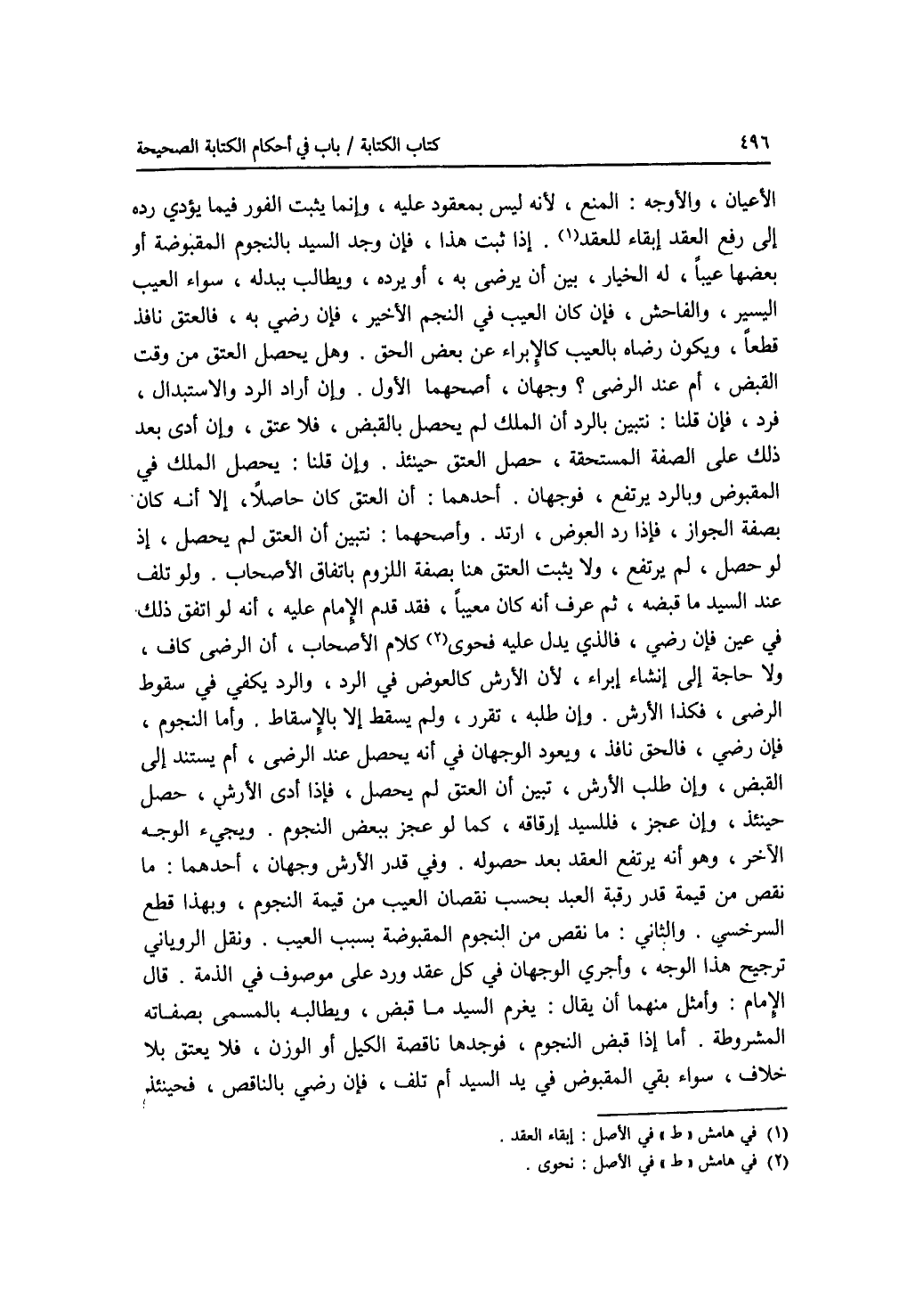 الاعيان، والاوجه: المنع، لانه ليس بمعقود عليه، وإنما يثبت الفور فيما يؤدي رده إلى رفع العقد ابقاء للعقد. إذا ثبت هذا، فإن وجد السيد بالنجوم المقبوضة أو بعضها عيبا، له الخيار، بين أن يرضى به، أو يرده، ويطالب ببدله، سواء العيب اليسير، والفاحش، فإن كان العيب في النجم الاخير، فإن رضي به، فالعتق نافذ قطعا، ويكون رضاه بالعيب كالابراء عن بعض الحق. وهل يحصل العتق من وقت القبض، أم عند الرضى ؟ وجهان، أصحهما: الاول. وإن أراد الرد والاستبدال، فرد، وإن قلنا: نتبين بالرد أن الملك لم يحصل بالقبض، فلا عتق، وإن أدى بعد ذلك على الصفة المستحقة، حصل العتق حينئذ. وإن قلنا: يحصل الملك في المقبوض وبالرد يرتفع، فوجهان. أحدهما: أن العتق كان حاصلا، إلا أنه كان بصفة الجواز، فإذا رد العوض، ارتد. وأصحهما: نتبين أن العتق لم يحصل، إذ لو حصل، لم يرتفع، ولا يثبت العتق هنا بصفة اللزوم باتفاق الاصحاب. ولو تلف عند السيد ما قبضه، ثم عرف أنه كان معيبا، فقد قدم الامام عليه، أنه لو اتفق ذلك في عين فإن رضي، فالذي يدل عليه فحوى كلام الاصحاب، أن الرضى كاف، ولا حاجة إلى إنشاء إبراء، لان الارش كالعوض فق الرد، والرد يكفي في سقوط الرضى، فكذا الارش. وإن طلبه، تقرر، ولم يسقط إلا بالاسقاط. وأما النجوم، فإن رضي، فالحق نافذ، ويعود الوجهان في أنه يحصل عند الرضى، أم يستند إلى القبض ؟ وإن طلب الارش، تبين أن العتق لم يحصل، فإذا أدى الارش، حصل حينئذ، وإن عجز، فللسيد إرقاقه، كما لو عجز ببعض النجوم. ويجئ الوجه الآخر، وهو أنه يرتفع العقد بعد حصوله. وفقدر الارش وجهان، أحدهما: ما نقص من قيمة قدر رقبة العبد بحسب نقصان العيب من قيمة النجوم، وبهذا قطع السرخسي. والثاني: ما نقص من النجوم المقبوضة بسبب العيب. ونقل الروياني ترجيح هذا الوجه، وأجري الوجهان في كل عقد ورد على موصوف في الذمة. قال الامام: وأمثل منهما أن يقال: يغرم السيد ما قبض، ويطالبه بالمسمى بصفاته المشروطة. أما إذا قبض النجوم، فوجدها ناقصة الكيل أو الوزن، فلا يعتق بلا خلاف، سواء بقي المقبوض في يد السيد أم تلف، فإن رضي بالناقص، فحينئذ