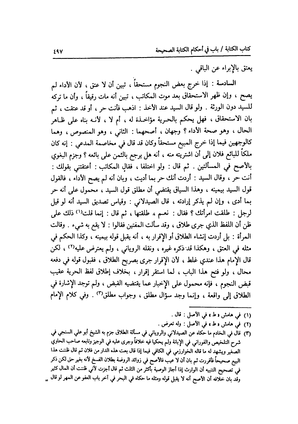 يعتق بالابراء عن الباقي. السادسة: إذا خرج بعض النجوم مستحقا، تبين أن لا عتق، لان الاداء لم يصح، وإن ظهر الاستحقاق بعد موت المكاتب، تبين أنه مات رقيقا، وأن ما تركه للسيد دون الورثة. ولو قال السيد عند الاخذ: اذهب فأنت حر، أو قد عتقت، ثم بان الاستحقاق، فهل يحكم بالحرية مؤاخذة له، أم لا، لانه بناه على ظاهر الحال، وهو صحة الاداء ؟ وجهان، أصحهما: الثاني، وهو المنصوص، وهما كالوجهين فيما إذا خرج المبيع مستحقا وكان قد قال في مخاصمة المدعي: إنه كان ملكا للبائع فلان إلى أن اشتريته منه، أنه هل يرجع بالثمن على بائعه ؟ وجزم البغوي بالاصح في المسألتين. ثم قال: ولو اختلفا، فقال المكاتب: أعتقتني بقولك: أنت حر، وقال السيد: أردت أنك حر بما أديت، وبان أنه لم يصح الاداء، فالقول قول السيد بيمينه، وهذا السياق يقتضي أن مطلق قول السيد، محمول على أنه حر بما أدى، وإن لم يذكر إرادته، قال الصيدلاني: وقياس تصديق السيد أنه لو قيل لرجل: طلقت امرأتك ؟ فقال: نعم، طلقتها، ثم قال: إنما قلت ذلك على ظن أن اللفظ الذي جرى طلاق، وقد سألت المفتين فقالوا: لا يقع به شئ. وقالت المرأة: بل أردت إنشاء الطلاق أو الاقرار به، أنه يقبل قوله بيمينه، وكذا الحكم في مثله في العتق، وهكذا قد ذكره غيره، ونقله الروياني، وليعترض عليه، لكن قال الامام هذا عندي غلط، لان الاقرار جرى بصريح الطلاق، فقبول قوله في دفعه محال، ولو فتح هذا الباب، لما استقر إقرار، بخلاف إطلاق لفظ الحرية عقيب قبض النجوم، فإنه محمول على الاخبار عما يقتضيه القبض، ولم توجد الاشارة في الطلاق إلى واقعة، وإنما وجد سؤال مطلق، وجواب مطلق. وفي كلام الامام
