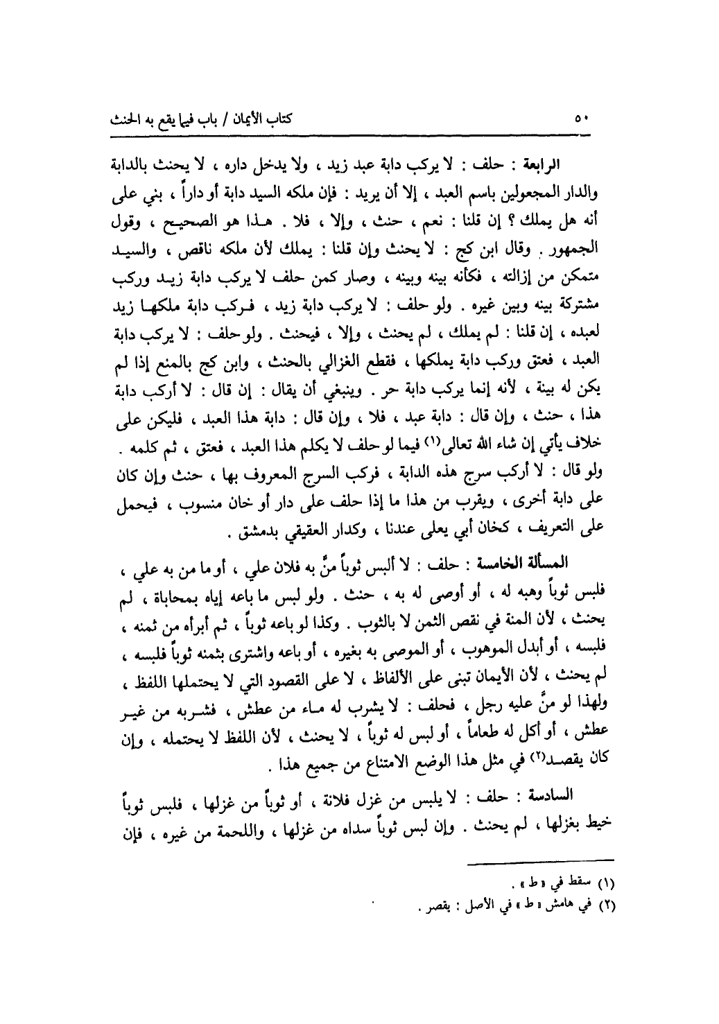 الرابعة: حلف: لا يركب دابة عبد زيد، ولا يدخل داره، لا يحنث بالدابة والدار المجعولين باسم العبد، إلا أن يريد: فإن ملكه السيد دابة أو دارا، بني على أنه هل يملك ؟ إن قلنا: نعم، حنث، وإلا، فلا. هذا هو الصحيح، وقول الجمهور. وقال ابن كج: لا يحنث وإن قلنا: يملك لان ملكه ناقص، والسيد متمكن من إزالته، فكأنه بينه وبينه، وصار كمن حلف لا يركب دابة زيد وركب مشتركة بينه وبين غيره. ولو حلف: لا يركب دابة زيد، فركب دابة كها زيد لعبده، إن قلنا: لم يملك، لم يحنث، وإلا فيحنث. ولو حلف: لا يركب دابة العبد، فعتق وركب دابة يمكها، فقطع الغزالي بالحنث، وابن كج بالمنع إذا لم يكن له بينة، لانه إنما يركب دابة حر. وينبغي أن يقال: إن قال: لا أركب دابة هذا، حنث، وإن قال: دابة عبد، فلا، وإن قال: دابة هذا العبد، فليكن على خلاف يأتي إن شاء الله فيما لو حلف لا يكلم هذا العبد، فعتق، ثم كلمه. ولو قال: لا أركب سرج هذه الدابة، فركب السرج المعروف بها، حنث وإن كان على دابة أخرى، ويقرب من هذا ما إذا حلف على دار أو خان منسوب، فيحمل على التعريف، كخان أبي يعلى عندنا، وكدار العقيقي بدمشق. المسألة الخامسة: حلف: لا ألبس ثوبا من به فلان علي، أو ما من به علي، فلبس ثوبا وهبه له، أو أوصى له به، حنث. ولو لبس ما باعه اياه بمحاباة، لم يحنث، لان المنة في نقص الثمن لا بالثوب. وكذا لو باعه ثوبا ثم أبرأه من ثمنه، فلبسه، أو أبدل الموهوب، أو الموصى به بغيره، أو باعه واشترى بثمنه ثوبا فلبسه، لم يحنث، لان الايمان تبنى على الالفاظ، لا على القصود التي لا يحتملها اللفظ، ولهذا لو من عليه رجل، فحلف: لا يشرب له ماء من عطش، فشربه من غير عطش، أو أكل له طعاما، أو لبس له ثوبا، لا يحنث، لان اللفظ لا يحتمله، وإن كان يقصد في مثل هذا الوضع الامتناع من جميع هذا. السادسة: حلف: لا يلبس من غزل فلانة، أو ثوبا من غزلها، فلبس ثوبا خيط بغزلها، لم يحنث وإن لبس ثوبا سداه من غزلها، واللحمة من غيره، فإن