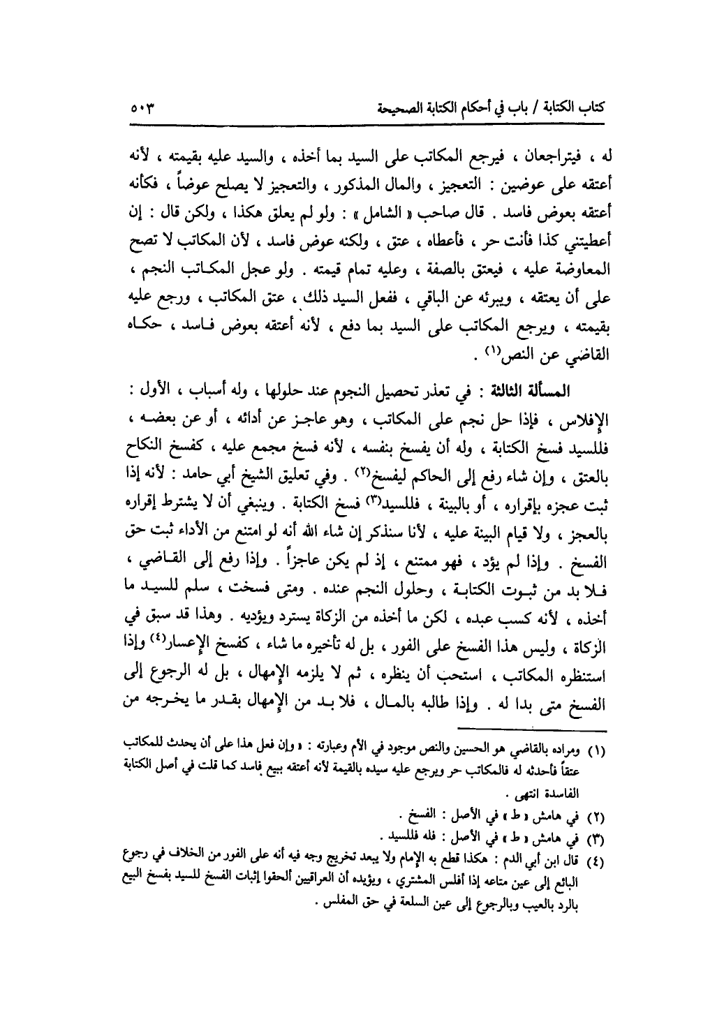 له، فيتراجعان، فيرجع المكاتب على السيد بما أخذه، والسيد عليه بقيمته، لانه أعتقه على عوضين: التعجيز، والمال المذكور، والتعجيز لا يصلح عوضا، فكأنه أعتقه بعوض فاسد. قال صاحب الشامل: ولو لم يعلق هكذا، ولكن قال: إن أعطيتني كذا فأنت حر، فأعطاه، عتق، ولكنه عوض فاسد، لان المكاتب لا تصح المعاوضة عليه، فيعتق بالصفة، وعليه تمام قيمته. ولو عجل المكاتب النجم، على أن يعتقه، ويبرئه عن الباقي، ففعل السيد ذلك، عتق المكاتب، ورجع عليه بقيمته، ويرجع المكاتب على السيد بما دفع، لانه أعتقه بعوض فاسد، حكاه القاضي عن النص. المسألة الثالثة: في تعذر تحصيل النجوم عند حلولها، وله أسباب، الاول: الافلاس، فإذا حل نجم على المكاتب، وهو عاجز عن أدائه، أو عن بعضه، فللسيد فسخ الكتابة، وله أن يفسخ بنفسه، لانه فسخ مجمع عليه، كفسخ النكاح بالعتق، وإن شاء رفع إلى الحاكم ليفسخ. وفي تعليق الشيخ أبي حامد: لانه إذا ثبت عجزه بإقراره، أو بالبينة فللسيفسخ الكتابة. وينبغي أن لا يشترط إقراره بالعجز، ولا قيام البينة عليه، لانا سنذكر إن شاء الله أنه لو امتنع من الاداء ثبت حق الفسخ. وإذا لم يؤد، فهو ممتنع، إذا لم يكن عاجزا. وإذا رفع إلى القاضي، فلا بد من ثبوت الكتابة، وحلول النجم عنده. ومتى فسخت، سلم للسيد ما أخذه، لانه كسب عبده، لكن ما أخذه من الزكاة يسترد ويؤديه. وهذا قد سبق في الزكاة، وليس هذا الفسخ على الفور، بل له تأخيره ما شاء، كفسخ الاعسار. وإذا استنظره المكاتب، استحب أن ينظره، ثم لا يلزمه الامهال، بل له الرجوع إلى الفسخ متى بدا له. وإذا طالبه بالمال، فلا بد من الامهال بقدر ما يخرجه من