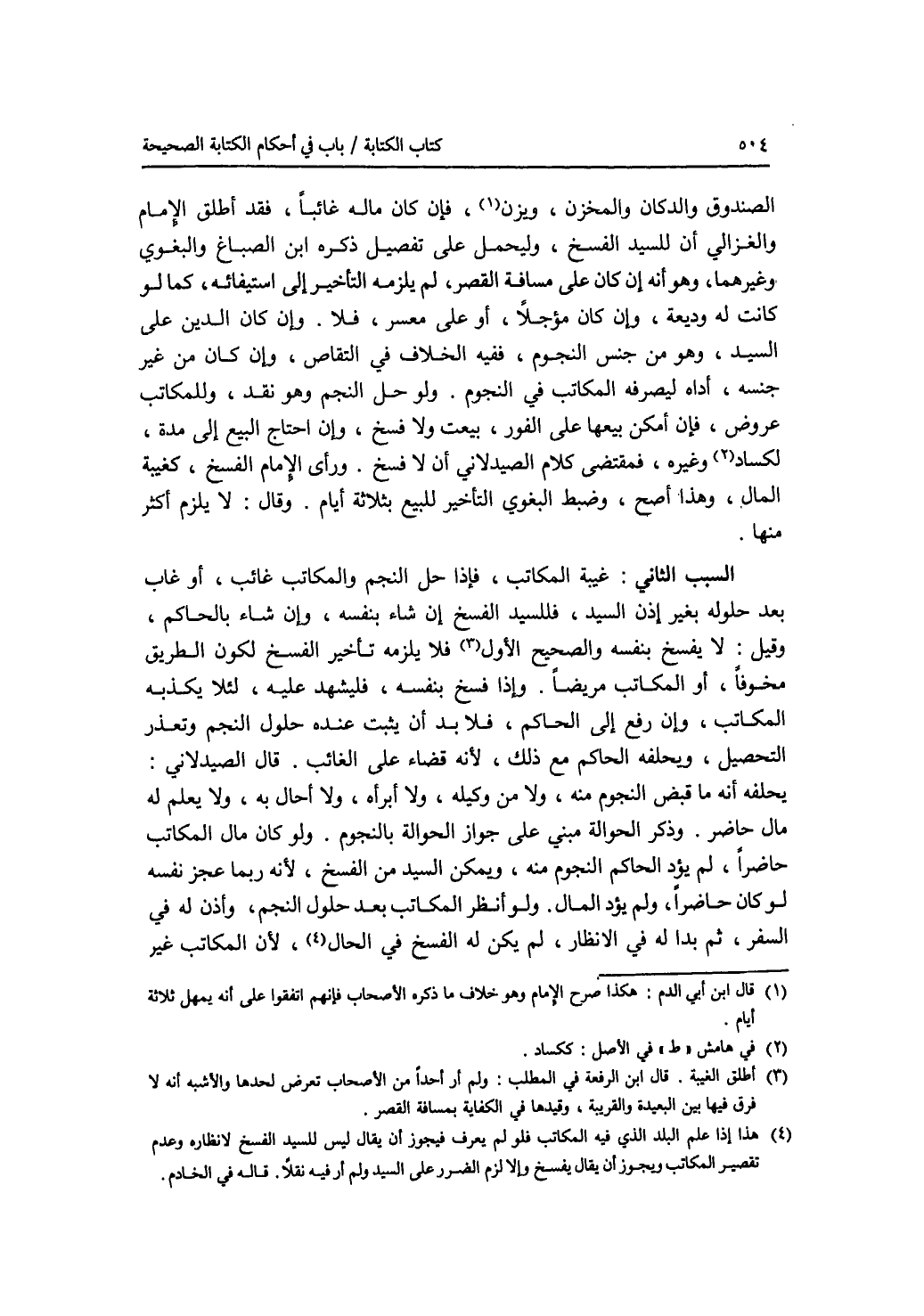 الصندوق والدكان والمخزن، ويزن فإن كان ماله غائبا، فقد أطلق الامام والغزالي أن السيد الفسخ، وليحمل على تفصيل ذكره ابن الصباغ والبغوي وغيرهما، وهو أنه إن كان على مسافة القصر، لم يلزمه التأخير إلى استيفائه، كما لو كانت له وديعة، وإن كان مؤجلا، أو على معسر، فلا. وإن كان الدين على السيد، وهو من جنس النجوم، ففيه الخلاف في التقاص، وإن كان من غير جنسه، أداه ليصرفه المكاتب في النجوم. ولو حل النجم وهو نقد، وللمكاتب عروض، فإن أمكن بيعها أمكن بيعها على الفور، بيعت ولا فسخ، وإن احتاج البيع إلى مدة، لكساد وغيره، فمقتضى كلام الصيدلاني أن لا فسخ. ورأى الامام الفسخ، كغيبة المال، وهذا أصح، وضبط البغوي التأخير للبيع بثلاثة أيام. وقال: لا يلزم أكثر منها. السبب الثاني: غيبة المكاتب، فإذا حل النجم، والمكاتب غائب، أو غاب بعد حلوله بغير إذن السيد، فللسيد الفسخ إن شاء بنفسه، وإن شاء بالحاكم، وقيل: لا يفسخ بنفسه والصحيح الاول فلا يلزمه تأخير الفسخ لكون الطريق مخوفا، أو المكاتب مريضا. وإذا فسخ بنفسه، فليشهد عليه، لئلا يكذبه المكاتب، وإن رفع إلى الحاكم، فلا بد أن يثبت عنده حلول النجم وتعذر التحصيل، ويحلفه الحاكم مع ذلك، لانه قضاء على الغائب. قال الصيدلاني: يحلفه أنه ما قبض النجوم منه، ولا من وكيله، ولا أبرأه، ولا أحال به، ولا يعلم له مال حاضر. وذكر الحوالة مبني على جواز الحوالة بالنجوم. ولو كان مال المكاتب حاضرا، لم يؤد الحاكم النجوم منه، ويمكن السيد من الفسخ، لانه ربما عجز نفسه لو كان حاضرا، ولم يؤد المال. ولو نظر المكاتب بعد حلول النجم، وأذن له في السفر، ثم بدا له في الانظار، لم يكن له الفسخ في الحال، لان المكاتب غير