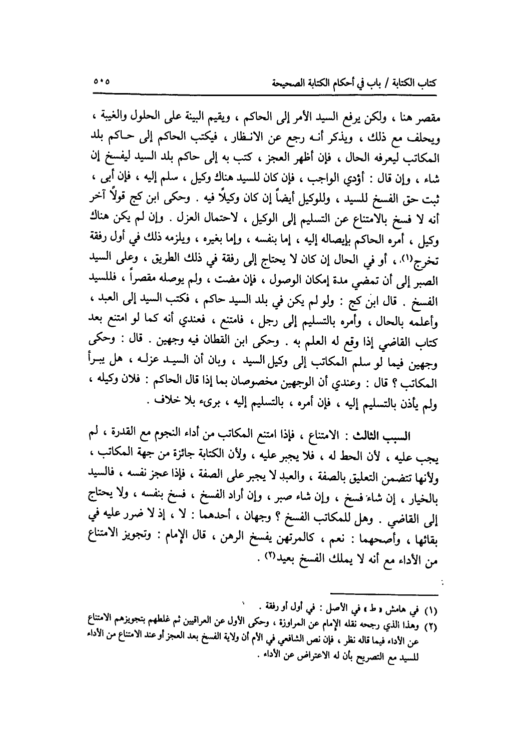 مقصر هنا، ولكن يرفع السيد الامر إلى الحاكم، ويقيم البينة على الحلول والغيبة، ويحلف مع ذلك، ويذكر أنه رجع عن الانظار، فيكتب الحاكم إلى حاكم بلد المكاتب ليعرفه الحال، فإن أظهر العجز، كتب به إلى حاكم بلد السيد ليفسخ إن شاء، وإن قال: أؤدي الواجب، فإن كان للسيد هناك وكيل، سلم إليه، فإن أبى، ثبت حق الفسخ للسيد، وللوكيل أيضا إن كان وكيلا فيه. وحكى ابن كج قولا آخر أنه لا فسخ بالامتناع عن التسليم إلى الوكيل، لاحتمال العزل. وإن لم يكن هناك وكيل، أمره الحاكم بإيصاله إليه، إما بنفسه، وإما بغيره، ويلزمه ذلك في أول رفقة تخرج، أو في الحال إن كان لا يحتاج إلى رفقة في ذلك الطريق، وعلى السيد الصبر إلى أن تمضي مدة إمكان الوصول، فإن مضت، ولم يوصله مقصرا، فللسيد الفسخ. قال ابن كج: ولو لم يكن في بلد السيد حاكم، فكتب السيد إلى العبد، وأعلمه بالحال، وأمره بالتسليم إلى رجل، فامتنع، فعندي أنه كما لو امتنع بعد كتاب القاضي إذا وقع له العلم به. وحكى ابن القطان فيه وجهين. قال: وحكى وجهين فيما لو سلم المكاتب إلى وكيل السيد، وبان أن السيد عزله، هل يبرأ المكاتب ؟ قال: قال: وعندي أن الوجهين مخصوصان بما إذا قال الحاكم: فلان وكيله، ولم يأذن بالتسليم إليه، فإن أمره، بالتسليم إليه، برئ بلا خلاف. السبب الثالث: الامتناع، فإذا امتنع المكاتب من أداء النجوم مع القدرة، لم يجب عليه، لان الحط له، فلا يجبر عليه، ولان الكتابة جائزة من جهة المكاتب، ولانها تتضمن التعليق بالصفة، والعبد لا يجبر على الصفة، فإذا عجز نفسه، فالسيد بالخيار، إن شاء فسخ، وإن شاء صبر، وإن أراد الفسخ، فسخ بنفسه، ولا يحتاج إلى القاضي. وهل للمكاتب الفسخ ؟ وجهان، أحدهما: لا، إذ لا ضرر عليه في بقائها، وأصحهما: نعم، كالمرتهن يفسخ الرهن، قال الامام: وتجويز الامتناع من الاداء مع أنه لا يملك الفسخ بعيد.
