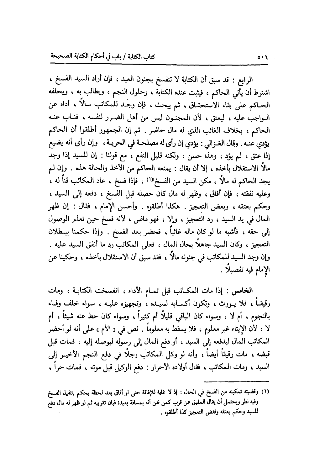 الرابع: قد سبق أن الكتابة لا تنفسخ بجنون العبد، فإن أراد السيد الفسخ، اشترط أن يأتي الحاكم، فيثبت عنده الكتابة، وحلول النجم، ويطالب به، ويحلفه الحاكم على بقاء الاستحقاق، ثم يبحث، فإن وجد للمكاتب مالا، أداه عن الواجب عليه، ليعتق، لان المجنون ليس من أهل الضرر لنفسه، فناب عنه الحاكم، بخلاف الغائب الذي له مال حاضر. ثم إن الجمهور أطلقوا أن الحاكم يؤدي عنه. وقال الغزالي: يؤدي إن رأى له مصلحة في الحرية، وإن رأى أنه يضيع إذا عتق، لم يؤد، وهذا حسن، ولكنه قليل النفع، مع قولنا: إن للسيد إذا وجد مالا الاستقلال بأخذه، إلا أن يقال: يمنعه الحاكم من الاخذ والحالة هذه. وإن لم يجد الحاكم له مالا، مكن السيد من الفسخ، فإذا فسخ، عاد المكاتب قنا له، وعليه نفقته، فإن أفاق، وظهر له مال كان حصله قبل الفسخ، دفعه إلى السيد، وحكم بعتقه، وبعض التعجيز. هكذا أطلقوه. وأحسن الامام، فقال: إن ظهر المال في يد السيد، رد التعجيز، وإلا، فهو ماض، لانه فسخ حين تعذر الوصول إلى حقه، فأشبه ما لو كان ماله غائبا، فحضر بعد الفسخ. وإذا حكمنا ببطلان التعجيز، وكان السيد جاهلا بحال المال، فعلى المكاتب رد ما أنفق السيد عليه. وإن وجد السيد للمكاتب في جنونه مالا، فقد سبق أن الاستقلال بأخذه، وحكينا عن الامام فيه تفصيلا. الخامس: إذا مات المكاتب قبل تمام الاداء، انفسخت الكتابة، ومات رقيقا، فلا يورث، وتكون أكسابه لسيده، وتجهيزه عليه، سواء خلف وفاء بالنجوم، أم لا، وسواء كان الباقي قليلا أم كثيرا، وسواء كان حط عنه شيئا، أم لا، لان الايتاء غير معلوم، فلا يسقط به معلوما. نص في الام على أنه لو أحضر المكاتب المال ليدفعه إلى السيد، أو دفع المال إلى رسوله ليوصله إليه، فمات قبل قبضه، مات رقيقا أيضا، وأنه لو وكل المكاتب رجلا في دفع النجم الاخير إلى السيد، ومات المكاتب، فقال أولاده الاحرار: دفع الوكيل قبل موته، فمات حرا،