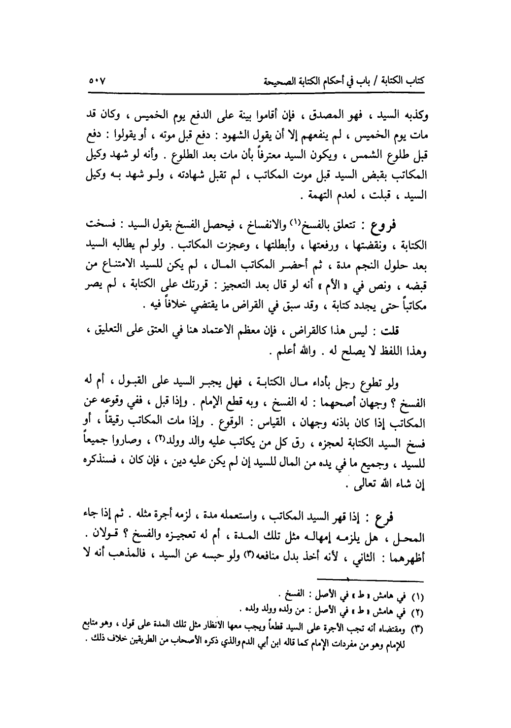 وكذبه السيد، فهو المصدق، فإن أقاموا بينة على الدفع يوم الخميس، وكان قد مات يوم الخميس، لم ينفعهم إلا أن يقول الشهود: دفع قبل موته، أو يقولوا: دفع قبل طلوع الشمس، ويكون السيد معترفا بأن مات بعد الطلوع. وأنه لو شهد وكيل المكاتب بقبض السيد قبل موت المكاتب، لم تقبل شهادته، ولو شهد به وكيل السيد، قبلت، لعدم التهمة. فروع تتعلق بالفسخ والانفساخ، فيحصل الفسخ بقول السيد: فسخت الكتابة، ونقضتها، ورفعتها، وأبطلتها، وعجزت المكاتب. ولو لم يطالبه السيد بعد حلول النجم مدة، ثم أحضر المكاتب المال، لم يكن للسيد الامتناع من قبضه، ونص في الام أنه لو قال بعد التعجيز: قررتك على الكتابة، لم يصر مكاتبا حتى يجدد كتابة، وقد سبق في القراض ما يقتضي خلافا فيه. قلت: ليس هذا كالقراض، فإن معظم الاعتماد هنا في العتق على التعليق، وهذا اللفظ لا يصلح له. والله أعلم. ولو تطوع رجل بأداءمال الكتابة، فهل يجبر السيد على القبول، أم له الفسخ ؟ وجهان أصحهما: له الفسخ، وبه قطع الامام. وإذا قبل، ففي وقوعه عن المكاتب إذا كانبإذنه وجهان القياس: الوقوع. وإذا مات المكاتب رقيقا، أو فسخ السيد الكتابة لعجزه، رق كل من يكاتب عليه والد وولد، وصاروا جميعا للسيد، وجميع ما في يده من المال للسيد إن لم يكن عليه دين، فإن كان، فسنذكره إن شاء الله تعالى. فرع إذا قهر السيد المكاتب، واستعمله مدة، لزمه أجرة مثله. ثم إذا جاء المحل، هل يلزم إمهاله مثل تلك المدة، أم له تعجيزه والفسخ ؟ قولان. أظهرهما: الثاني، لان أخذ بدل منافعه. ولو حبسه عن السيد، فالمذهب، فالمذهب أنه لا