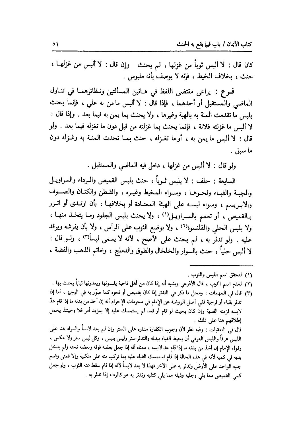 كان قال: لا ألبس ثوبا من غزلها، لم يحنث. وإن قال: لا ألبس من غزلها، حنث، بخلاف الخيط، فإنه لا يوصف بأنه ملبوس. فرع يراعى مقتضى اللفظ في هاتين المسألتين ونظائرهما في تناول الماضي والمستقبل أو أحدهما، فإذا قال: لا ألبس ما من به علي، فإنما يحنث بلبس ما تقدمت المنة به بالهبة وغيرها، ولا يحنث بما يمن به فيما بعد. وإذا قال: لا ألبس ما غزلته فلانة، فإنما يحنث بما غزلته من قبل دون ما تغزله فيما بعد. ولو قال: لا ألبس ما يمن به، أو ما تغزله، حنث بما تحدث المنة به وغزله دون ما سبق. ولو قال: لا ألبس من غزلها، دخل فيه الماضي والمستقبل. السابعة: حلف: لا يلبس ثوبا، حنث بلبس القميص والرداء والسراويل والجبة والقباء ونحوها، وسواء المخيط وغيره، والقطن والكتان والصوف والابريسم، وسواء لبسه على الهيئة المعتادة أو بخلافها، بأن ارتدى أو اتزر بالقميص، أو تعمم بالسراويل، ولا يحنث بلبس الجلود وما يتخذ منها، ولا بلبس الحلي والقلنسوة، ولا بوضع الثوب على الرأس، ولا بأن يفرشه ويرقد عليه. ولو تدثر به، لم يحنث على الاصح، لانه لا يسمى لبسا، ولو قال: لا ألبس حليا، حنث بالسوار والخلخال والطوق والدملج، وخاتم الذهب والفضة،