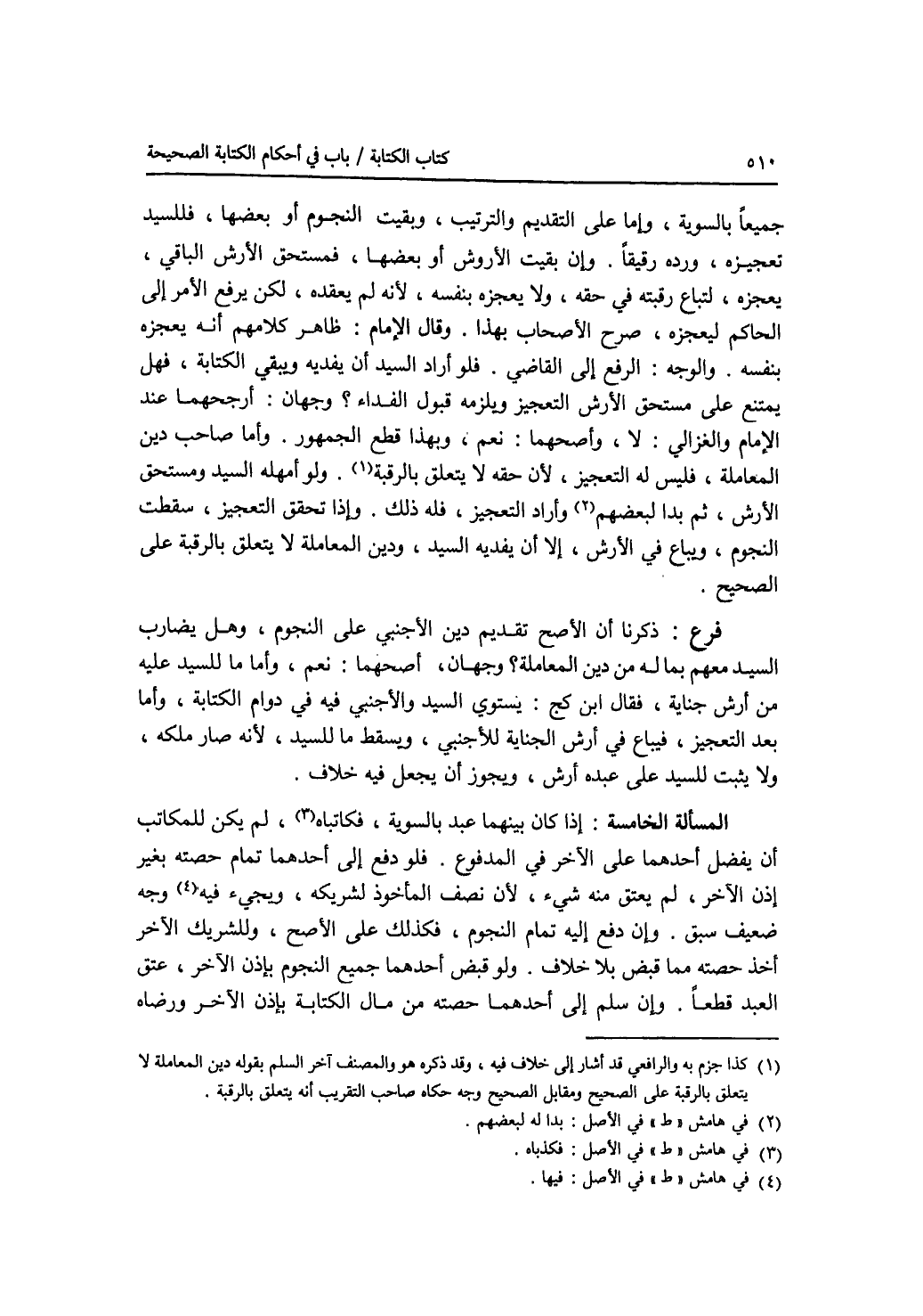 جميعا بالسوية، وإما على التقديم والترتيب، وبقيت النجوم أو بعضها، فللسيد تعجيزه، ورده رقيقا. وإن بقيت الاروش أو بعضها فمستحق الارش الباقي، لعجزه، لتباع رقبته في حقه، ولا يعجزه بنفسه، لانه لم يعقده، لكن يرفع الامر إلى الحاكم ليعجزه، صرح الاصحاب بهذا. وقال الامام: ظاهر كلامهم أنه يعجزه بنفسه، لانه لم يعقده، لكن يرفع الامر إلى الحاكم ليعجزه، بنفسه، والوجه: الرفع إلى القاضي. فلو أراد السيد أن يفديه ويبقي الكتابة، فهل يمتنع على مستحق الارش التعجيز ويلزمه قبول الفداء ؟ وجهان: أرجحهما عند الامام والغزالي: لا، وأصحهما: نعم، وبهذا قطع الجمهور. وأما صاحب دين المعاملة، فليس له التعجيز، لان حقه لا يتعلق بالرقبة. ولو أمهله السيد ومستحق الارش، ثم بدا لبعضهم وأراد التعجيز، فله ذلك. وإذا تحقق التعجيز، سقطت النجوم، ويباع في الارش، إلا أن يفديه السيد، ودين المعاملة لا يتعلق بالرقبة على الصحيح. فرع ذكرنا أن الاصح تقديم دين الاجنبي على النجوم، وهل يضارب السيد معهم بماله من دين المعاملة ؟ وجهان، أصحهما: نعم، وأما ما للسيد عليه من أرش جناية، فقال ابن كج: يستوي السيد والاجنبي فيه في دوام الكتابة، وأما بعد التعجيز، فيباع في أرش الجناية للاجنبي، ويسقط ما للسيد، لانه صار ملكه، ولا يثبت للسيد على عبده أرش، ويجوز أن يجعل فيه خلاف. المسألة الخامسة: إذا كان بينهما عبد بالسوية، فكاتباه، لم يكن للمكاتب أن يفضل أحدهما على الآخر في المدفوع. فلو دفع إلى أحدهما تمام حصته بغير إذن الآخر، لم يعتق منه شئ، لان نصف المأخوذ لشريكه، ويجئ فيه وجه ضعيف سبق. وإن دفع إليه تمام النجوم، فكذلك على الاصح، وللشريك الآخر أخذ حصته مما قبض بلا خلاف. ولو قبض أحدهما جميع النجوم بإذن الآخر، عتق العبد قطعا. وإن سلم إلى أحدهما حصته من مال الكتابة بإذن الآخر ورضاه