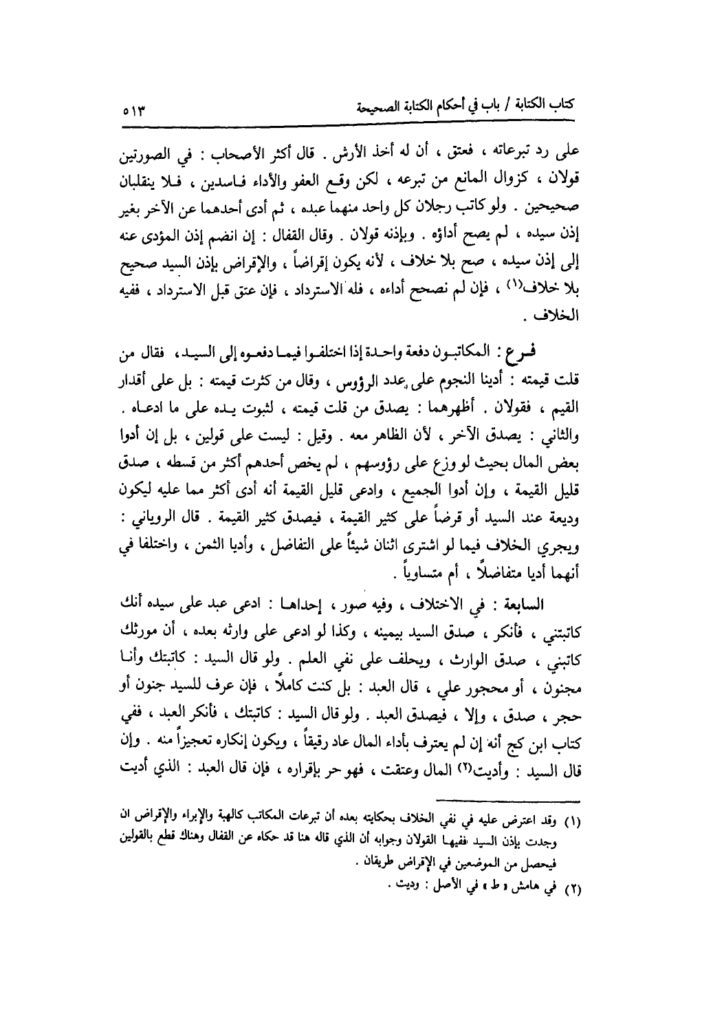 على رد تبرعاته، فعتق، أن له أخذ الارش. قال أكثر الاصحاب: في الصورتين قولان، كزوال المانع من تبرعه، لكن وقع العفو والاداء فاسدين، فلا ينقلبان صحيحيحن. ولو كاتب رجلان كل واحد منهما عبده، ثم أدى أحدهما عن الآخر بغير إذن سيده، لم يصح أداءه، وبإذنه قولان. وقال القفال: إن انضم إذن المؤدى عنه إلى آذن سيده، صح بلا خلاف، لانه يكون إقراضا، والاقراض بإذن السيد صحيح بلا خلاف، فإن لم نصحح أداءاه، فله الاسترداد، فإن عتق قبل الاسترداد، ففيه الخلاف. فرع المكاتبون دفعة واحدة إذا اختلفوا فيما دفعه إلى السيد، فقال من قلت قيمته: أدينا النجوم على عدد الرؤوس، وقال من كثرت قيمته: بل على أقدار القيم، فقولان. أظهرهما: يصدق من قلت قيمته، لثبوت يده على ما ادعاه. والثاني: يصدق الآخر، لان الظاهر معه. وقيل: ليست على قولين، بل إن أدوا بعض المال بحيث لو وزع على رؤوسهم، لم يخص أحدهم أكثر من قسطه، صدق قليل القيمة، وإن أدوا الجميع، وادعى قليل القيمة أنه أدى أكثر ممن عليه ليكون وديعة عند السيد أو قرضا على كثير القيمة، فيصدق كثير القيمة. قال الروياني: ويجري الخلاف فيما لو اشترى اثنان شيئا على التفاضل، وأديا الثمن واختلفا في أنهما أديا متفاضلا، أم متساويا. السابعة: في الاختلاف، وفي صور، إحداهما: ادعى عبد على سيده انك كاتبتني، فأنكر، صدق السيد بيمينه، وكذا لوادعى على وارثه بعده، أن مورثك كاتبني، صدق الوارث، ويحلف على نفي العلم ولو قال السيد: كاتبتك وأنا مجنون، أو محجور علي، قال العبد: بل كنت كاملا، فإن عرف للسيد جنون أو حجر، صدق، وإلا، فيصدق العبد. ولو قال السيد: كاتبتك، فأنكر العبد، ففي كتاب ابن كج أنه إن لم يعترف بأداء المال عاد رقيقا، ويكون إنكاره تعجيزا منه. وإن قال السيد وأديت المال وعتقت، فهو حر بإقراره، فإن قال العبد: الذي أديت
