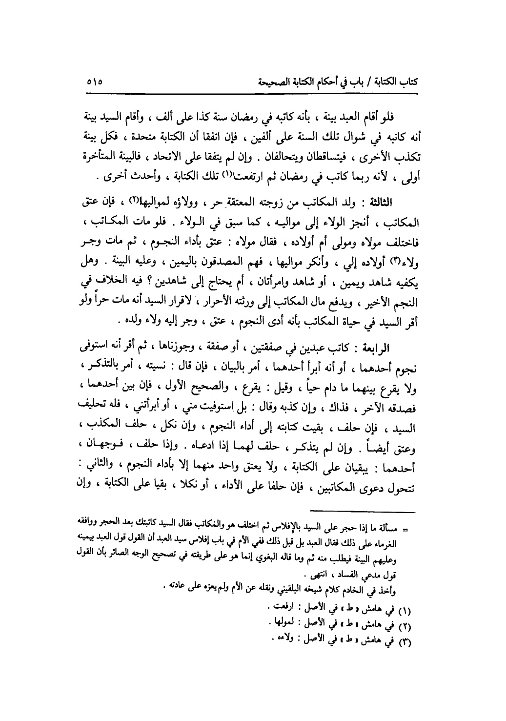 فلو أقام العبد بينة، بأنه كاتبه في رمضان سنة كذا على ألف، وأقام السيد بينة أنه كاتبه في شوال تلك السنة على ألفين، فإن اتفقا أن الكتابة متحدة، فكل بينة تكذب الاخرى، فيتساقطان ويتحالفان. وإن لم يتفقا على الاتحاد، فالبينة المتأخرة أولى، لانه ربما كاتب في رمضان ثم ارتفعت تلك الكتابة، وأحدث أخرى. الثالثة: ولد المكاتب من زوجته المعتقة حر، وولاؤه لمواليها، فإن عتق المكاتب، انجر الولاء إلى مواليه، كما سبق في الولاء. فلو مات المكاتب، فاختلف مولاه ومولى أم أولاده، فقال مولاه: عتق بأداء النجوم، ثم مات وجر ولاء أولاده إلي، وأنكر مواليها، فهم المصدقون باليمين، وعليه البينة. وهل يكفيه شاهد ويمين، أو شاهد وامرأتان، أم يحتاج إلى شاهدين ؟ فيه الخلاف في النجم الاخير، ويدفع مال المكاتب إلى ورثته الاحرار، لاقرار السيد أنه مات حرا. ولو أقر السيد في حياة المكاتب بأنه أدى النجوم، عتق، وجر إليه ولاء ولده. الرابعة: كاتب عبدين في صفقتين، أو صفقة، وجوزناها، ثم أقر أنه استوفى نجوم أحدهما، أو أنه أبرأ أحدهما، أمر بالبيان، فإن قال: نسيته، أمر بالتذكر، ولا يقرع بينهما ما دام حيا، وقيل: يقرع، والصحيح الاول، فإن بين أحدهما، فصدقه الآخر، فذاك، وإن كذبه وقال: بل استوفيت مني، أو أبرأتني، فله تحليف السيد، فإن حلف، بقيت كتابته إلى أداء النجوم، وإن نكل، حلف المكذب، وعتق أيضا. وإن لم يتذكر، حلف لهما إذا ادعاه. وإذا حلف، فوجهان، أحدهما: يبقيان على الكتابة، ولا يعتق واحد منهما إلا بأداء النجوم، والثاني: تتحول دعوى المكاتبين، فإن حلفا على الاداء، أو نكلا، بقيا على الكتابة، وإن