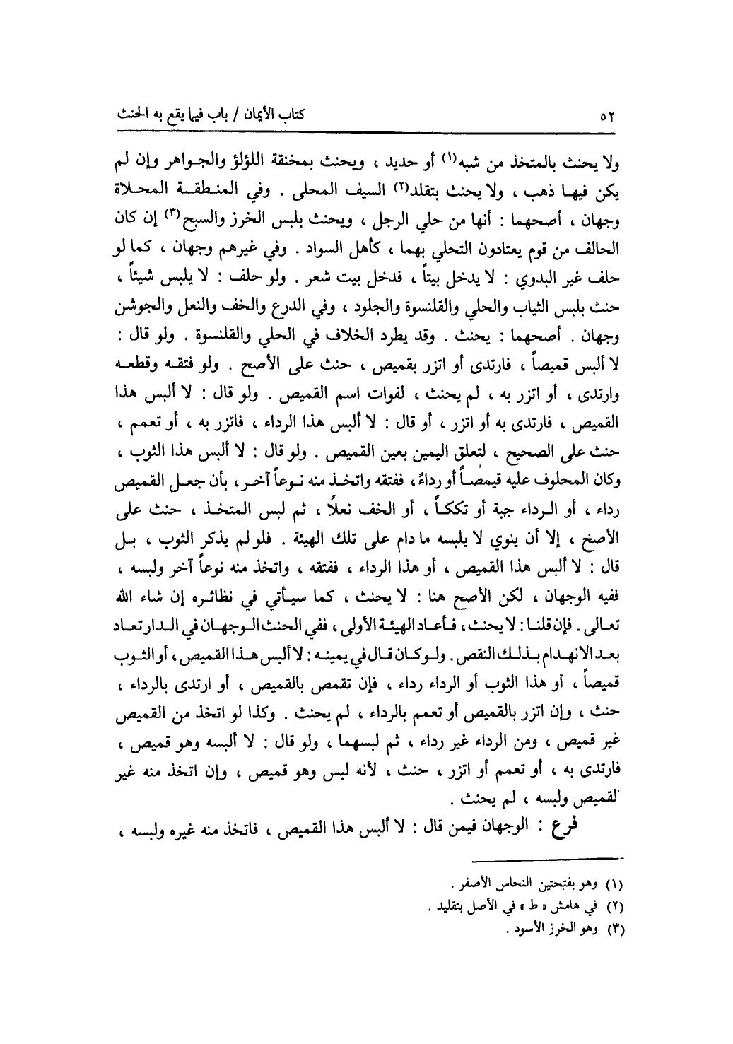 ولا يحنث بالمتخذ من شبه أو حديد، ويحنث بمخنقة اللؤلؤ والجواهر وإن لم يكن فيها ذهب، ولا يحنث بتقلد السيف المحلى. وفي المنطقة المحلاة وجهان، أصحهما: أنها من حلي الرجل، ويحنث بلبس الخرز والسبج إن كان الحالف من قوم يعتادون التحلي بهما، كأهل السواد. وفي غيرهم وجهان، كما لو حلف غير البدوي: لا يدخل بيتا، فدخل بيت شعر. ولو حلف: لا يلبس شيئا، حنث بلبس الثياب والحلي والقلنسوة والجلود وفي الدرع والخف والنعل والجوشن وجهان. أصحهما: يحنث، وقد يطرد الخلاف في الحلي والقلنسوة. ولو قال: لا ألبس قميصا، فارتدى أو اتزر بقميص، حنث على الاصح، ولو فتقه وقطعه وارتدى، أو اتزر به، لم يحنث، لفوات اسم القميص. ولو قال: لا ألبس هذا القميص، فارتدى به أو اتزر، أو قال: لا ألبس هذا الرداء، فاتزر به، أتعمم، حنث على الصحيح، لتعلق اليمين بعين القميص. ولو قال: لا ألبس هذا الثوب، وكان المحلوف عليه قميصا أو رداء، ففتقه واتخذ منه نوعا آخر، بأن جعل القميص رداء، أو الرداء جبة أو تككا، أو الخف نعلا، ثم لبس المتخذ، حنث على الاصح، إلا أن ينوي لا يلبسه ما دام على تلك الهيئة. فلو لم يذكر الثوب، بل قال: لا ألبس هذا القميص، أو هذا الرداء، ففتقه، واتخذ منه نوعا آخر ولبسه، ففيه الوجهان، لكن الاصح هنا: لا يحنث، كما سيأتي في نظائره إن شاء الله تعال. فإن قلنا: لا يحنث، فأعاد الهيئة الاولى، ففي الحنث الوجهان في الدار تعاد بعد الانهدام بذلك النقص. ولو كان قال في يمينه: لا ألبس هذا القميص، أو الثوب قميصا، أو هذا الثوب أو الرداء رداء، فإن تقمص بالقميص، أو ارتدى بالرداء، حنث، وإن اتزر بالقميص أو تعمم بالرداء، لم يحنث. وكذا لو اتخذ من القميص غير قميص، ومن الرداء غير رداء، ثم لبسهما، ولو قال: لا ألبسه وهو قميص، فارتدى به، أو تعمم أو اتزر، حنث، لانه لبس وهو قميص، وإن اتخذ منه غير القميص ولبسه، لم يحنث. فرع الوجهان فيمن قال: لا ألبس هذا القميص، فاتخذ منه غيره ولبسه،