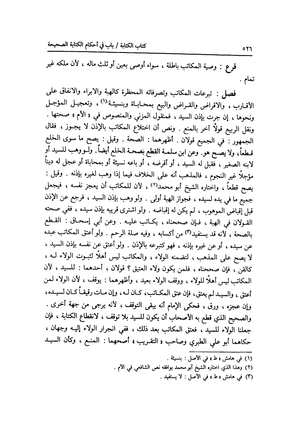 فرع وصية المكاتب باطلة، سواء أوصى بعين أو ثلث ماله، لان ملكه غير تمام. فصل تبرعات المكاتب وتصرفاته المحظرة كالهبة والابراء والانفاق على الاقارب، والاقراض والقراض والبيع بمحاباة وبنسيئة، وتعجيل المؤجل ونحوها، إن جرت بإذن السيد، فمنقول المزني والمنصوص في الام صحتها. ونقل الربيع قولا آخر بالمنع. ونص أن اختلاع المكاتب بالاذن لا يجوز، فقال الجمهور: في الجميع قولان. أظهرهما: الصحة. وقيل: يصح ما سوى الخلع قطعا، ولا يصح هو. وعن ابن سلمة القطع بصحة الخلع أيضا. ولو وهب للسيد أو لابنه الصغير، فقبل له السيد، أو أقرضه، أو باعه نسيئة أو بمحاباة أو عجل له دينا مؤجلا غير النجوم، فالمذهب أنه على الخلاف فيما إذا وهب لغيره بإذنه. وقيل: يصح قطعا، واختاره الشيخ أبو محمد، لان للمكاتب أن يعجز نفسه، فيجعل جميع ما في يده لسيده، فجواز الهبة أولى. ولو وهب بإذن السيد، فرجع عن الاذن قبل إقباض الموهوب، لم يكن له إقباضه. ولو اشترى قريبه بإذن السيد، ففي صحته القولان في الهبة، فإن صححناه يكاتب عليه. وعن أبي إسحق: القطع بالصحة، لانه قد يستفيد من أكسابه، وفيه صلة الرحم. ولو أعتق المكاتب عبده عن سيده، أو عن غيره بإذنه، فهو كتبرعه بالاذن. ولو أعتق عن نفسه بإذن السيد، لا يصح على المذهب، لتضمنه الولاء، والمكاتب ليس أهلا لثبوت الولاء له، كالقن، فإن صححناه، فلمن يكون ولاء العتيق ؟ قولان، أحدهما: للسيد، لان المكاتب ليس أهلا للولاء، ووقف الولاء بعيد، وأظهرهما: يوقف، لان الولاء لمن أعتق، والسيد لم يعتق، فإن عتق المكاتب، هان له، وإن مات رقيقا، كان لسيده، وإن عجزه، ورق، فحكى الامام أنه يبقى التوقف، لانه يرجى عتقه من جهة أخرى. والصحيح الذي قطع به الاصحاب أن يكون للسيد بلا توقف، لانقطاع الكتابة، فإن جعلنا الولاء للسيد، فعتق المكاتب بعد ذلك، ففي انجرار الولاء إليه وجهان، حكاهما أبو علي الطبري وصاحب التقريب أصحهما: المنع، وكأن السيد