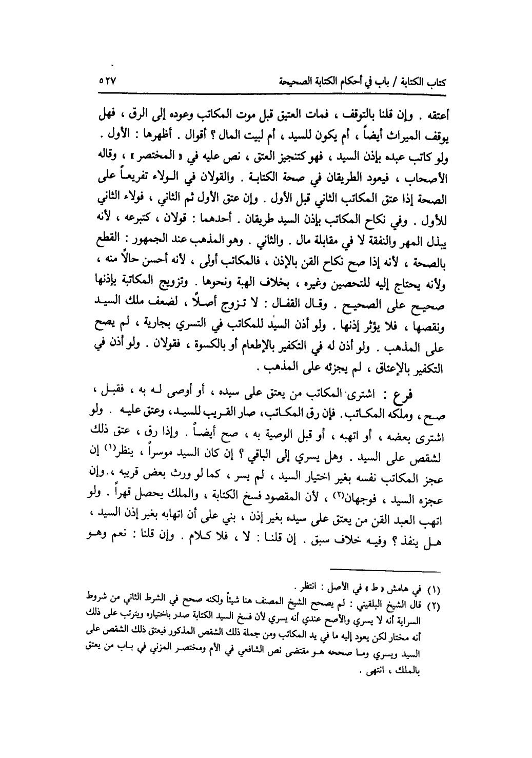 أعتقه. وإن قلنا بالتوقف، فمات العتيق قبل موت المكاتب وعوده إلى الرق، فهل يوقف الميراث أيضا، أم يكون للسيد، أم لبيت المال ؟ أقوال. أظهرها: الاول. ولو كاتب المكاتب عبده بإذن السيد، فهو كتنجيز العتق، نص عليه في المختصر، وقاله الاصحاب، فيعود الطريقان في صحة الكتابة. والقولان في الولاء تفريعا على الصحة إذا عتق المكاتب الثاني قبل الاول. وإن عتق الاول ثم الثاني، فولاء الثاني للاول. وفي نكاح المكاتب بإذن السيد طريقان. أحدهما: قولان، كتبرعه، لانه يبذل المهر والنفقة لا في مقابلة مال. والثاني. وهو المذهب عند الجمهور: القطع بالصحة، لانه إذا صح نكاح القن بالاذن، فالمكاتب أولى، لانه أحسن حالا منه، ولانه يحتاج إليه للتحصين وغيره، بخلاف الهبة ونحوها. وتزويج المكاتبة بإذنها صحيح على الصحيح. وقال القفال: لا تزوج أصلا، لضعف ملك السيد ونقصها، فلا يؤثر إذنها. ولو أذن السيد للمكاتب في التسري بجارية، لم يصح على المذهب. ولو أذن له في التكفير بالاطعام أو بالكسوة، فقولان ولو أذن في التكفير بالاعتاق، لم يجزئه على المذهب. فرع > اشترى المكاتب من يعتق على سيده، أو أوصى له به، فقبل، صح، وملكه المكاتب. فإن رق المكاتب، صار القريب للسيد، وعتق عليه. ولو اشترى بعضه، أو اتهبه، أو قبل الوصية به، صح أيضا. وإذا رق، عتق ذلك الشقص على السيد. وهل يسري إلى الباقي ؟ إن كان السيد موسرا، ينظر إن عجز المكاتب نفسه بغير اختيار السيد، لم يسر، كما لو ورث بعض قريبه، وإن عجزه السيد، فوجهان. لان المقصود فسخ الكتابة، والملك يحصل قهرا. ولو اتهب العبد القن من يعتق على سيده بغير إذن، بني على أن اتهابه بغير إذن السيد، هل ينقذ ؟ وفيه خلاف سبق. إن قلنا: لا، فلا كلام. وإن قلنا: نعم وهو
