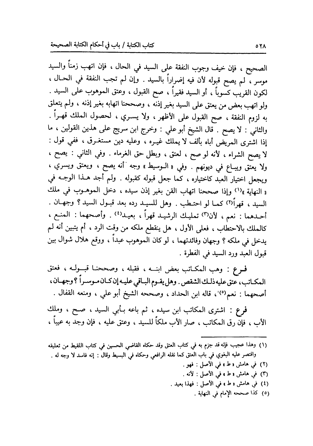 الصحيح، فإن خيف وجوب النفقة على السيد في الحال، فإن اتهب زمنا والسيد موسر، لم يصح قبوله لان فيه إضرارا بالسيد. وإن لم يجب النفقة في الحال، لكون القريب كسوبا، أو السيد فقيرا، صح القبول، وعتق الموهوب على السيد. ولو اتهب بعض من يعتق على السيد بغير إذنه، وصححنا اتهابه بغير إذنه، ولم يتعلق به لزوم النفقة، صح القبول على الاظهر، ولا يسري، لحصول الملك قهرا. والثاني: لا يصح. قال الشيخ أبو علي: وخرج ابن سريج على هذين القولين، ما إذا اشترى المريض أباه بألف لا يملك غيره، وعليه دين مستغرق، ففي قول: لا يصح الشراء، لانه لو صح، لعتق، وبطل حق الغرماء. وفي الثاني: يصح، ولا يعتق ويباع في ديونهم. وفي الوسيط وجه أنه يصح، ويعتق ويسري، ويجعل اختيار العبد كاختياره، كما جعل قبوله كقبوله. ولم أجد هذا الوجه في النهاية وإذا صححنا اتهاب القن بغير إذن سيده، دخل الموهوب في ملك السيد، قهرا كما لو احتطب. وهل للسيد رده بعد قبول السيد ؟ وجهان. أحدهما: نعم، لان تمليك الرشيد قهرا، بعيد. وأصحهما: المنع، كالملك بالاحتطاب، فعلى الاول هل ينقطع ملكه من وقت الرد، أم يتبين أنه لم يدخل في ملكه ؟ وجهان وفائدتهما، لو كان الموهوب عبدا، ووقع هلال شوال بين قبول العبد ورد السيد في الفطرة. فرع وهب المكاتب بعض ابنه، فقبله، وصححنا قبوله، فعتق المكاتب، عتق عليه ذلك الشقص. وهل يقوم الباقي عليه إن كان موسرا ؟ وجهان، أصحهما: نعم، قاله ابن الحداد، وصححه الشيخ أبو علي، ومنعه القفال فرع اشترى المكاتب ابن سيده، ثم باعه بأبي السيد، صح، وملك الاب، فإن رق المكاتب، صار الاب ملكا للسيد، وعتق عليه، فإن وجد به عيبا،