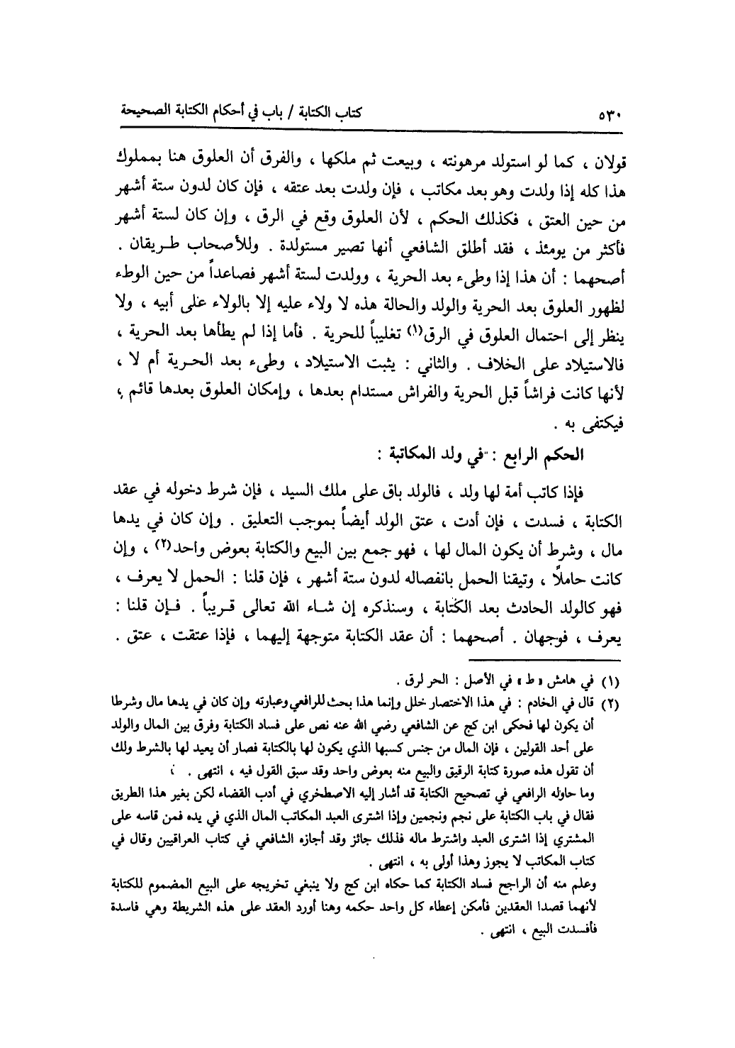 قولان، كما لو استولد مرهونته، وبيعت ثم ملكها، والفرق أن العلوق هنا بمملوك هذا كله إذا ولدت وهو بعد مكاتب، فإن ولدت بعد عتقه، فإن كان لدون ستة أشهر من حين العتق، فكذلك الحكم، لان العلوق وقع في الرق، وإن كان لستة أشهر فأكثر من يومئذ، فقد أطلق الشافعي أنها تصير مستولدة. وللاصحاب طريقان. أصحهما: أن هذا إذا وطئ بعد الحرية، وولدت لستة أشهر فصاعدا من حين الوطئ لظهور العلوق بعد الحرية والولد والحالة هذه لا ولاء عليه إلا بالولاء على أبيه، ولا ينظر إلى احتمال العلوق في الرق تغليبا للحرية. فأما إذا لم يطأها بعد الحرية، فالاستيلاد على الخلاف. والثاني: يثبت الاستيلاد، وطئ بعد الحرية أم لا، لانها كانت فراشا قبل الحرية والفراش مستدام بعدها، وإمكان العلوق بعدها قائم، فيكتفى به. الحكم الرابع: في ولد المكاتبة: فإذا كاتب أمة لها ولد، فالولد باق على ملك السيد، فإن شرط دخوله في عقد الكتابة، فسدت، فإن أدت، عتق الولد أيضا بموجب التعليق. وإن كان في يدها مال، وشرط أن يكون المال لها، فهو جمع بين البيع والكتابة بعوض واحد. وإن كانت حاملا، وتيقنا الحمل بانفصاله لدون ستة أشهر، فإن قلنا: الحمل لا يعرف، فهو كالولد الحادث بعد الكتابة، وسنذكره إن شاء الله تعالى قريبا. فإن قلنا: يعرف، فوجهان. أصحهما: أن عقد الكتابة متوجهة إليهما، فإذا عتقت، عتق.