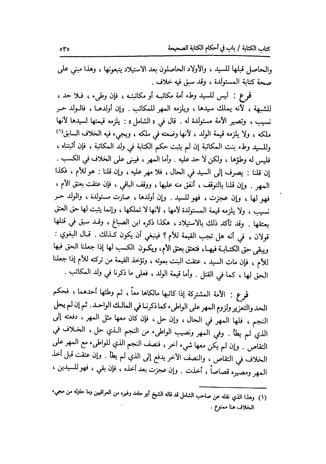 والحاصل قبلها للسيد، والاولاد الحاصلون بعد الاستيلاد يتبعونها، وهذا مبني على صحة كتابة المستولدة، وقد سبق فيه خلاف. فرع ليس للسيد وطئ أمة مكاتبه أو مكاتبته، فإن وطئ، فلا حد، للشبهة، لانه يملك سيدها، ويلزمه المهر للمكاتب. وإن أولدها، فالولد حر نسيب، وتصير الامة مستولدة له. قال في الشامل: يلزمه قيمتها لسيدها لانها ملكه، ولا يلزمه قيمة الولد، لانها وضعته في ملكه، ويجيئ فيه الخلاف السابق. وللسيدوطئ بنت المكاتبة إن لم يثبت حكم الكتابة في ولد المكاتبة، فإن أثبتناه فليس له وطؤها، ولكن لا حد عليه. وأما المهر، فيبنى على الخلاف في الكسب. إن قلنا: يصرف إلى السيد في الحال، فلا مهر عليه، وإن قلنا: هو للام، فكذا المهر. وإن قلنا بالتوقف، أنفق منه عليها، ووقف الباقي، فإن عتقت بعتق الام، فهو لها، وإن عجزت، فهو للسيد. وإن أولدها، صارت مستولدة، والولد حر نسيب، ولا يلزمه قيمة المستولدة لامها، لانها لا تملكها، وإنما يثبت لها حق العتق بعتقها. وقد تأكد ذلك بالاستيلاد، هكذا ذكره ابن الصباغ، وقد سبق في قتلها قولان، في أنه هل تجب القيمة للام ؟ فينبغي أن يكون كذلك. قال البغوي: ويبقى حق الكتابة فيها، فتعتق بعتق الام، ويكون الكسب لها إذا جعلنا الحق فيها للام، فإن مات السيد، عتقت البنت بموته، وتؤخذ القيمة من تركته للام إذا جعلنا الحق لها، كما في القتل. وأما قيمة الولد، فعلى ما ذكرنا في ولد المكاتب. فرع الامة المشتركة إذا كاتبها مالكاها معا، ثم وطئها أحدهما، فحكم الحد والتعزير ولزوم المهر على الواطئ كما ذكرنا في المالك الواحد. ثم إن لم يحل النجم، فلها المهر في الحال، وإن حل، فإن كان معها مثل المهر، دفعته إلى الذي لم يطأ. وفي المهر ونصيب الواطئ من النجم الذي حل، الخلاف في التقاص وإن لم يكن معها شئ آخر، فنصف النجم الذي للواطئ مع المهر على الخلاف في التقاص، والنصف الآخر يدفع إلى الذي لم يطأ وإن عتقت قبل أخذ المهر ومصيره قصاصا، أخذت وإن عجزت بعد أخذه، فإن بقي، فهو للسيدين،