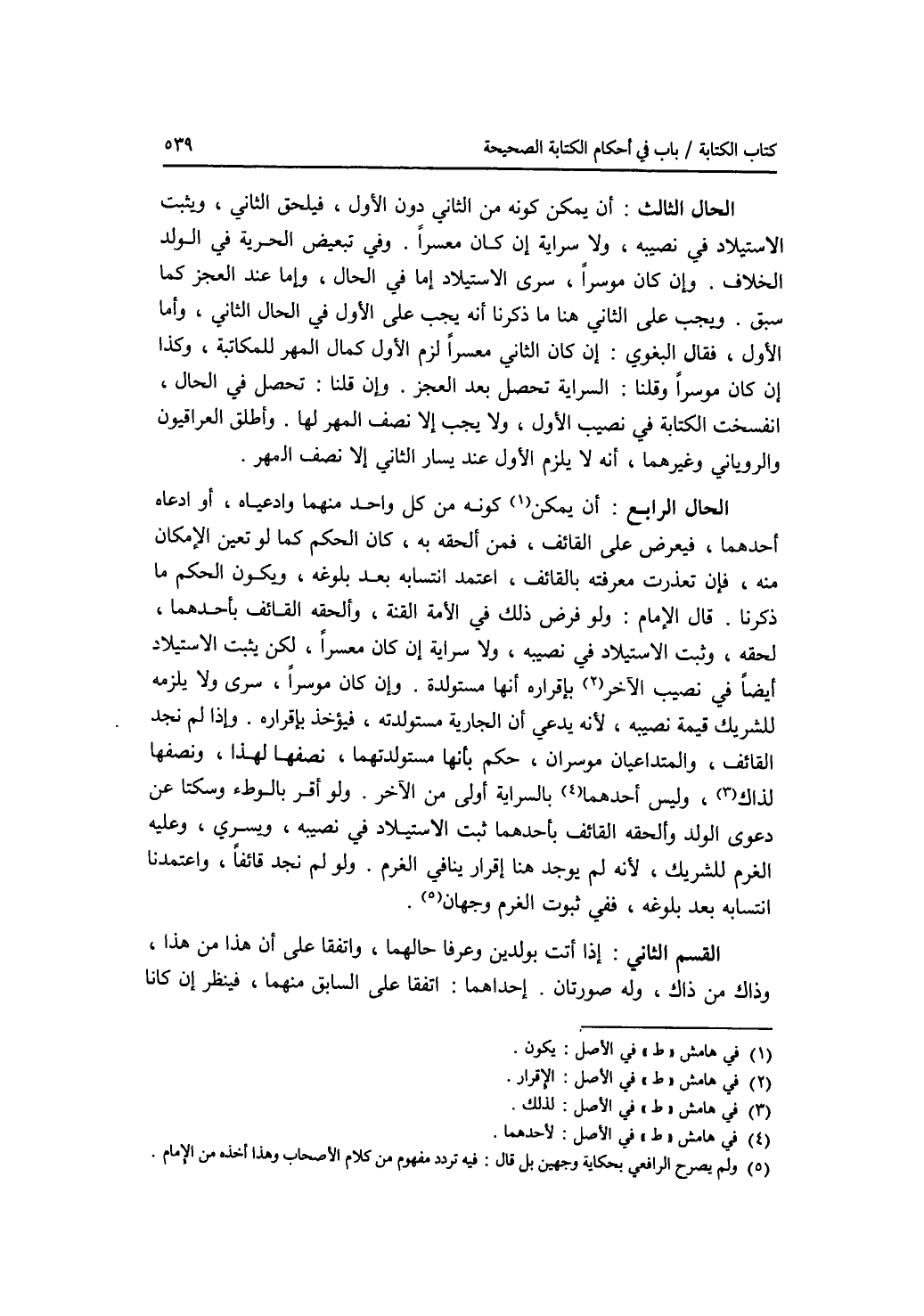 الحال الثالث: أن يمكن كونه من الثاني دون الاول، فيلحق الثاني، ويثبت الاستيلاد في نصيبه، ولا سراية إن كان معسرا. وفي تبعيض الحرية في الولد الخلاف. وإن كان موسرا، سرى الاستيلاد إما في الحال، وإما عند العجز كما سبق. ويجب على الثاني هنا ما ذكرنا أنه يجب على الاول في الحال الثاني، وأما الاول، فقال البغوي: إن كان الثاني معسرا لزم الاول كمال المهر للمكاتبة، وكذا إن كان موسرا وقلنا: السراية تحصل بعد العجز. وإن قلنا: تحصل في الحال، انفسخت الكتابة في نصيب الاول، ولا يجب إلا نصف المهر لها. وأطلق العراقيون والروياني وغيرهما، أنه لا يلزم الاول عند يسار الثاني إلا نصف المهر. الحال الرابع: أن يمكن كونه من كل واحد منهما وادعياه، أو ادعاه أحدهما، فيعرض على القائف، فمن ألحقه به، كان الحكم كما لو تعين الامكان منه، فإن تعذرت معرفته بالقائف، اعتمد انتسابه بعد بلوغه، ويكون الحكم ما ذكرنا. قال الامام: ولو فرض ذلك في الامة، القنة، وألحقه القائف بأحدهما، لحقه، وثبت الاستيلاد في نصيبه، ولا سراية إن كان معسرا، لكن يثبت الاستيلاد أيضا في نصيب الآخر بإقراره أنها مستولدة. وإن كان موسرا، سرولا يلزمه للشريك قيمة نصيبه، لانه يدعي أن الجارية مستولدته، فيؤخذ بإقراره. وإذا لم نجد القائف والمتد اعيان موسران، فلم بأنها مستولدتهما، نصفهما لهذا، ونصفها لذاك، وليس أحدهما بالسراية أولى من الآخر. ولو أقر بالوطئ وسكتا عن دعوى الولد وألحقه القائف بأحدهما ثبت الاستيلاد في. نصيبه، ويسري، وعليه الغرم للشريك، لانه لم يوجد هنا إقرار ينافي الغرم. ولو لم نجد قائفا، وإعتمدنا انتسابه بعد بلوغه، ففي ثبوت الغرم وجهان. القسم الثاني: إذا أتت بولدين وعرفا حالهما، واتفقا على أن هذا من هذا، وذاك من ذاك، وله صورتان إحداهما: اتفقا على السابق منهما، فينظر إن كانا