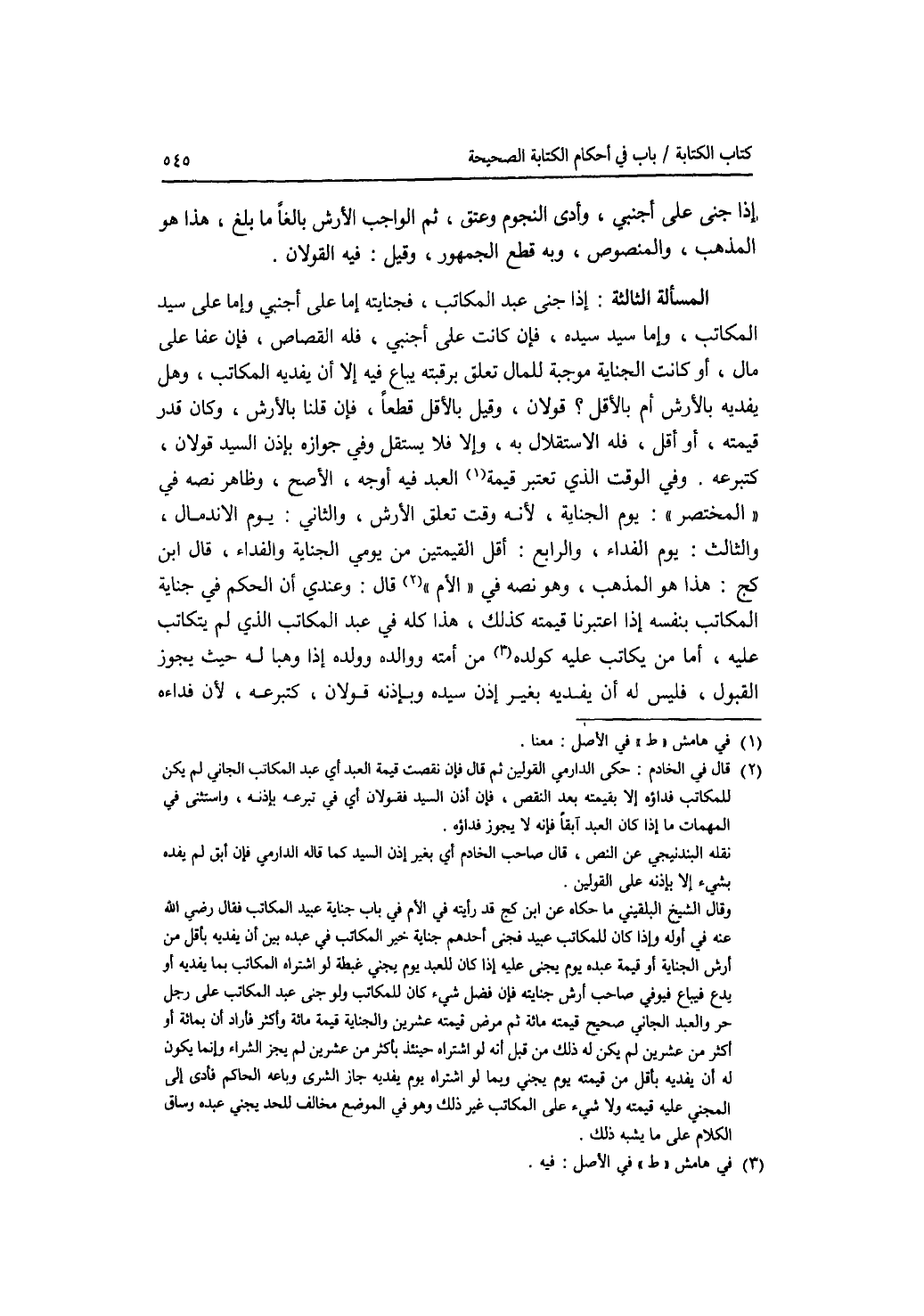 إذا جنى على أجنبي، وأدى النجوم وعتق، ثم الواجب الارش بالغا ما بلغ، هذا هو المذهب، والمنصوص، وبه قطع الجمهور، وقيل: فيه القولان. المسألة الثالثة: إذا جنى عبد المكاتب، فجنايته إما على أجنبي وإما على سيد المكاتب، وإما سيد سيده، فإن كانت على أجنبي، فله القصاص، فإن عفا على مال، أو كانت الجناية موجبة للمال تعلق برقبته يباع فيه إلا أن يفديه المكاتب، وهل يفديه بالارش أم بالاقل ؟ قولان، وقيل بالاقل قطعا، فإن قلنا بالارش، وكان قدر قيمته، أو أقل، فله الاستقلال به، وإلا فلا يستقل وفي جوازه بإذن السيد قولان، كتبرعه. وفي الوقت الذي تعتبر قيمة العبد فيه أوجه، الاصح، وظاهر نصه في المختصر: يوم الجناية، لانه وقت تعلق الارش، والثاني: يوم الاندمال، والثالث: يوم الفداء، والرابع: أقل القيمتين من يومي الجناية والفداء، قال ابن كج: هذا هو المذهب، وهو نصه في الام قال: وعندي أن الحكم في جناية المكاتب بنفسه إذا اعتبرنا قيمته كذلك، هذا كله في عبد المكاتب الذي لم يتكاتب عليه، أما من يكاتب عليه كولده من أمته ووالده وولده إذا وهبا له حيث يجوز القبول، فليس له أن يفديه بغير إذن سيده وبإذنه قولان، كتبرعه، لان فداءه