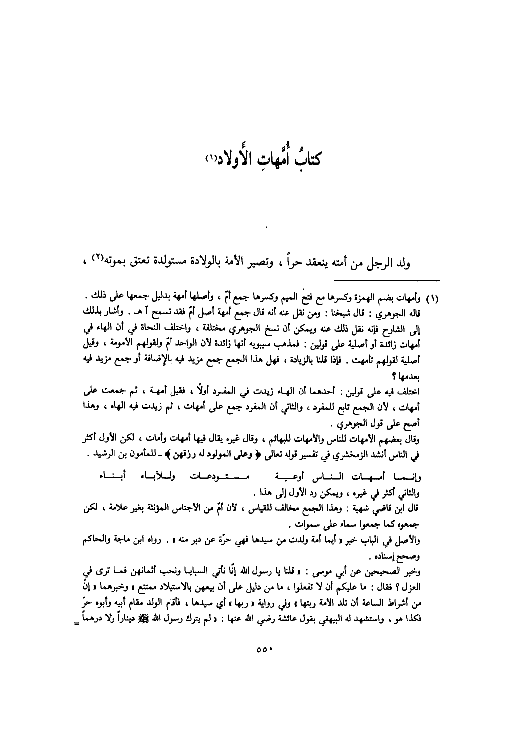 ولد الرجل من أمته ينعقد حرا، وتصير الامة بالولادة مستولدة تعتق بموته،