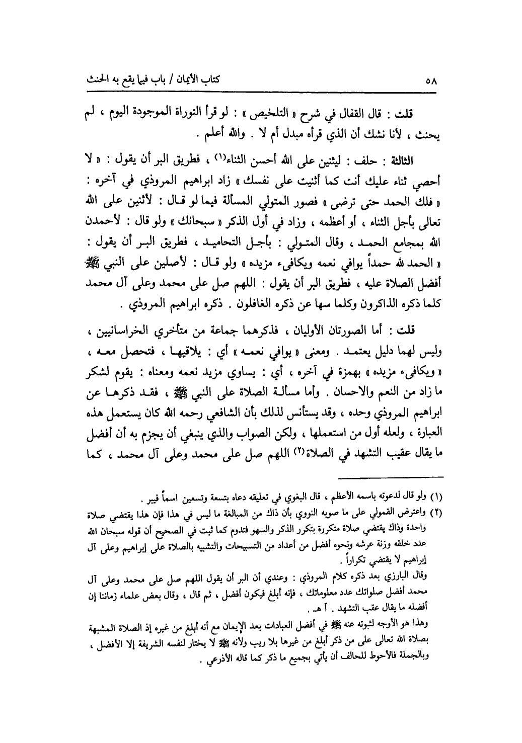 قلت: قال القفال في شرح التلخيص: لو قرأ التوراة الموجودة اليوم، لم يحنث، لانا نشك أن الذي قرأه مبدل أم لا. والله أعلم. الثالثة: حلف: ليثنين على الله أحسن الثناء، فطريق البر أيقول: لا أحصي ثناء عليك أنت كما أثنيت على نفسك زاد ابرهيم المروزي في آخره: فلك الحمد حتى ترضى فصور المتولي المسألة فيما لو قال: لاثنين على الله تعالى بأجل الثناء، أو أعظمه، وزاد في أول الذكر سبحانك ولو قال: لاحمدن الله بمجامع الحمد، وقال المتولي: بأجل التحاميد، فطريق البر أن يقول: الحمد لله حمدا يوافي نعمه ويكافئ مزيده ولو قال: لاصلين على النبي - صلى الله عليه وسلم - أفضل الصلاة عليه، فطريق البر أن يقول: اللهم صل على الله محمد وعلى آل محمد كلما ذكره الذاكرون وكلما سها عن ذكره الغافلون. ذكره ابرهيم المروذي. قلت: أما الصورتان الاوليان، فذكرهما جماعة من متأخري الخراسانيين، وليس لهما دليل يعتمد. ومعنى يوافي نعمه أي: يلاقيها، فتحصل معه، ويكافئ مزيده بهمزة في آخره، أي: يساوي مزيد نعمه ومعناه: يقوم لشكر ما زاد من النعم والاحسان. وأما مسألة الصلاة على النبي - صلى الله عليه وسلم -، فقد ذكرها عن ابرهيم المروزي وحده، وقد يستأنس لذلك بأن الشافعي رحمه الله كان يستعمل هذه العبارة، ولعله أول من استعملها، ولكن الصواب والذي ينبغي أن يجزم به أن أفضل ما يقال عقيب التشهد في الصلاة: اللهم صل على محمد وعلى آل محمد، كما