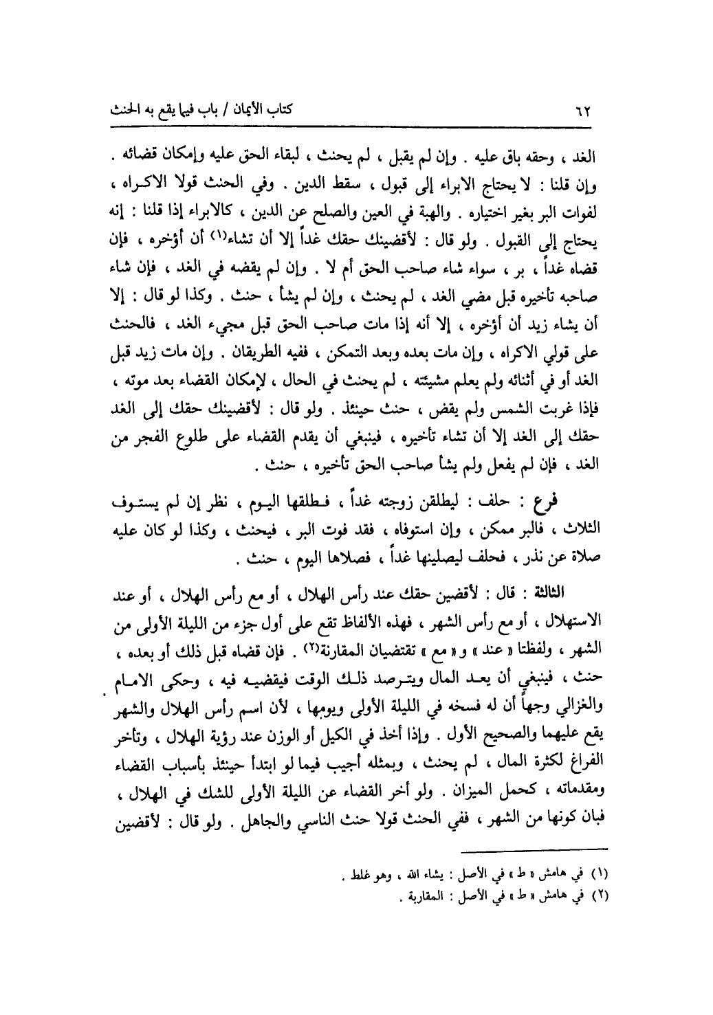 الغد، وحقه باق عليه. وإن لم يقبل، لم يحنث، لبقاء الحق عليه وإمكان قضائه. وإن قلنا: لا يحتاج الابراء إلى قبول، سقط الدين. وفي الحنث قولا الاكراه، لفوات البر بغير اختياره. والهبة في العين والصلح عن الدين، كالابراء إذا قلنا: إنه يحتاج إلى القبول. ولو قال: لاقضينك حقك غدا إلا أن تشاء أن أؤخره، فإن قضاه غدا، بر، سواء شاء صاحب الحق أم لا. وإن لم يقضه في الغد، فإن شاء صاحبه تأخيره قبل مضي الغد، لم يحنث، وإن لم يشأ، حنث. وكذا لو قال: إلا أن يشاء زيد أن أؤخره، إلا أنه إذا مات صاحب الحق قبل مجئ الغد، فالحنث على قولي الاكراه، وإن مات بعده وبعد التمكن، ففيه الطريقان. وإن مات زيد قبل الغد أو في أثنائه ولم يعلم مشيئته، لم يحنث في الحال، لامكان القضاء بعد موته، فإذا غربت الشمس ولم يقض، حنث حينئذ. ولو قال: لاقضينك ك حقك إلى الغد إلا أن تشاء تأخيره، فينبغي أن يقدم القضاء على طلوع الفجر من الغد، فإن لم يفعل ولم يشأ صاحب الحق تأخيره، حنث. فرع حلف: ليطلقن زوجته غدا، فطلقها اليوم، نظر إن لم يستوف الثلاث، فالبر ممكن، وإن استوفاه، فقد فوت البر، فيحنث، وكذا لو كان عليه صلاة عن نذر، فحلف ليصلينها غدا، فصلاها اليوم، حنث. الثالثة: قال: لاقضين حقك عند رأس الهلال، أو مع رأس الهلال، أو عند الاستهلال، أو مع رأس الشهر، فهذه الالفاظ تقع على أول جزء من الليلة الاولى من الشهر، ولفظتا عند ومع تقتضيان المقارنة. فإن قضاه قبل ذلك أو بعده، حنث، فينبغي أن يعد المال ويترصد ذلك الوقت فيقضيه فيه، وحكى الامام والغزالي وجها أن له فسخه في الليلة الاولى ويومها، لان اسم رأس الهلال والشهر يقع عليهما والصحيح الاول. وإذا أخذ في الكيل أو الوزن عند رؤية الهلال، وتأخر الفراغ لكثرة المال، لم يحنث، وبمثله أجيب فيما لو ابتدأ حينئذ بأسباب القضاء ومقدماته، كحمل الميزان. ولو أخر القضاء عن اليلة الاولى للشك في الهلال ، فبان كونها من الشهر، ففي الحنث قولا حنث الناسي والجاهل. ولو قال: لاقضين