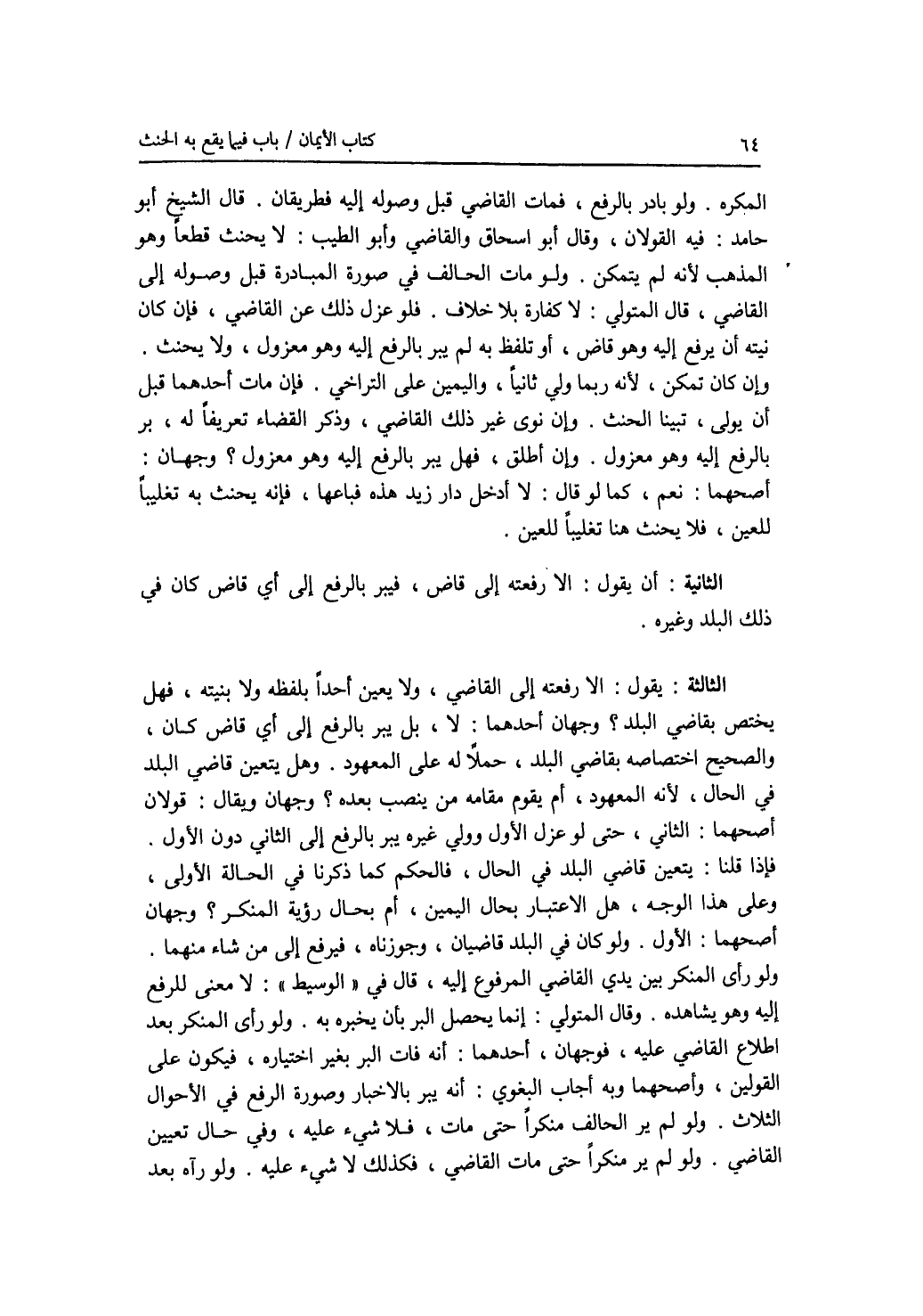 المكره. ولو بادر بالرفع، فمات القاضي قبل وصوله إليه فطريقان. قال الشيخ أبو حامد: فيه القولان، وقال أبو إسحق والقاضي أبو الطيب: لا يحنث قطعا وهو المذهب لانه لم يتمكن. ولو مات الحالف في صورة المبادرة قبل وصوله إلى القاضي، قال المتولي: لا كفارة بلا خلاف. فلو عزل ذلك القاضي، فإن كان نيته أن يرفع إليه وهو قاض، أو تلفظ به لم يبر بالرفع إليه وهو معزول، ولا يحنث. وإن كان تمكن، لانه ربما ولي ثانيا، واليمين على التراخي. فإن مات أحدهما قبل أن يولى، تبينا الحنث، وإن نوى غير ذلك القاضي، وذكر القضاء تعريفا له، بر بالرفع إليه وهو معزول. وإن أطلق، فهل يبر بالرفع إليه وهو معزول ؟ وجهان: أصحهما: نعم، كما لو قال: لا أدخل دار زيد هذه فباعها، فإنه يحنث به تغليبا للعين، فلا يحنث هنا تغليبا للعين. الثانية: أن يقول: إلا رفعته إلى قاض، فيبر بالرفع إلى أي قاض كان في ذلك البلد وغيره. الثالثة: يقول: إلا رفعته إلى القاضي، ولا يعين أحدا بلفظه ولا بنيته، فهل يختص بقاضي البلد ؟ وجهان أحدهما: لا، بل يبر بالرفع إلى أي قاض كان، والصحيح اختصاصه بقاضي البلتد حملا له على المعهود. وهل يتعين قاضي البلد في الحال، لانه المعهود، أم يقوم مقامه من ينصب بعده ؟ وجهان ويقال: قولان أصحهما: الثاني، حتى لو عزل الاول وولي غيره يبر بالرفع إلى الثاني دون الاول. فإذا قلنا: يتعين قاضي البلد في الحال، فالحكم كما ذكرنا في الحالة الاولى، وعلى هذا الوجه، هل الاعتبار بحال اليمين، أم بحال رؤية المنكر ؟ وجهان أصحهما: الاول. ولو كان في ا لبلد قاضيان، وجوزناه، فيرفع إلى من شاء منهما. ولو رأى المنكر بين يدي القاضي المرفوع إليه، قال في الوسيط: لا معنى للرفع إليه وهو يشاهده. وقال المتولي: إنما يحصل البر بأن يخبره به. ولو رأى المنكر بعد اطلاع القاضي عليه، فوجهان، أحدهما أنه فات البر بغير اختياره، فيكون على القولين، وأصحهما وبه أجاب البغوي: أنه يبر بالاخبار وصورة الرفع في الاحوال الثلاث. ولو لم ير الحالف منكرا حتى مات، فلا شئ عليه، وفي حال تعيين القاضي. ولو لم ير منكرا حتى مات القاضي، فكذلك لا شئ عليه. ولو رآه بعد