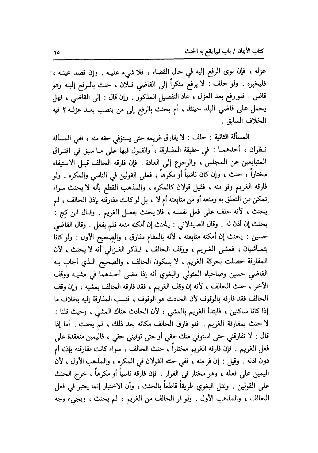 عزله، فإن نوى الرفع إليه في حال القضاء، فلا شئ عليه. وإن قصد عينه، فليخبره. ولو حلف: لا يرفع منكرا إلى القاضي فلان، حنث بالرفع إليه وهو قاض. فلو رفع بعد العزل، عاد التفصيل المذكور. وإن قال: إلى القاضي، فهل يحمل على قاضي البلد حينئذ، أم يحنث بالرفع إلى من ينصب بعد عزله ؟ فيه الخلاف السابق. المسألة الثانية: حلف: لا يفارق غريمه حتى يستوفي حقه منه، ففي المسألة نظران، أحدهما: في حقيقة المفارقة، والقول فيها على ما سبق في افتراق المتبايعين عن المجلس، والرجوع إلى العادة. فإن فارق الحالف قبل الاستيفاء مختارا، حنث، وإن كان ناسيا أو مكرها، فعلى القولين في الناسي والمكره. ولو فارقه الغريم وفر منه، فقيل قولان كالمكره، والمذهب القطع بأنه لد يحنث سواء تمكن من التعلق به ومنعه أو من متابعته أم لا، بل لو كانت مفارقته بإذن الحالف، لم يحنث، لانه حلف على فعل نفسه، فلا يحنث بفعل الغريم. وقال ابن كج: يحنث إن أذن له. وقال الصيدلاني: يحنث إن أمكنه منعه فلم يفعل. وقال القاضى حسين: يحنث إن أمكنه متابعته، لانه بالمقام مفارق، والصحيح الاول: ولو كانا يتماشيان، فمشى الغريم، ووقف الحالف، فذكر الغزالي أنه لا يحنث، لان الفارقة حصلت بحركة الغرم، لا بسكون الحالف، والصحيح الذي أجاب به القاضي حسين وصاحباه المتولي والبغوي أنه إذا مضى أحدهما في مشيه ووقف الآخر، حنث الحالف، لانه إن وقف الغريم، فقد فارقه الحالف بمشيه، وإن وقف الحالف فقد فارقه بالوقوف لان الحادث هو الوقوف، فنسب المفارقة إليه بخلاف ما إذا كانا ساكنين، فابتدأ الغريم بالمشي، لان الحادث هناك المشي، وحيث قلنا: لا حنث بمفارقة الغريم. فلو فارق الحالف مكانه بعد ذلك، لم يحنث. أما إذا قال: لا تفارقني حتى استوفي منك حقي أو حتى توفيني حقي، فاليمين منعقدة على فعل الغريم. فإن فارقه الغريم مختارا، حنث الحالف، سواء كانت مفارقته بإذنه أم دون إذنه. وقيل: إن فر منه، ففي حنثه القولان في المكره، والمذهب الاول، لان اليمين على فعله، وهو مختار في الفرار. فإن فارقه ناسيا أو مكرها، خرج الحنث على القولين. ونقل البغوي طريقا قاطعا بالحنث، وأن الاختيار إنما يعتبر في فعل الحالف، والمذهب الاول. ولو فر الحالف من الغريم، لم يحنث، ويجئ وجه