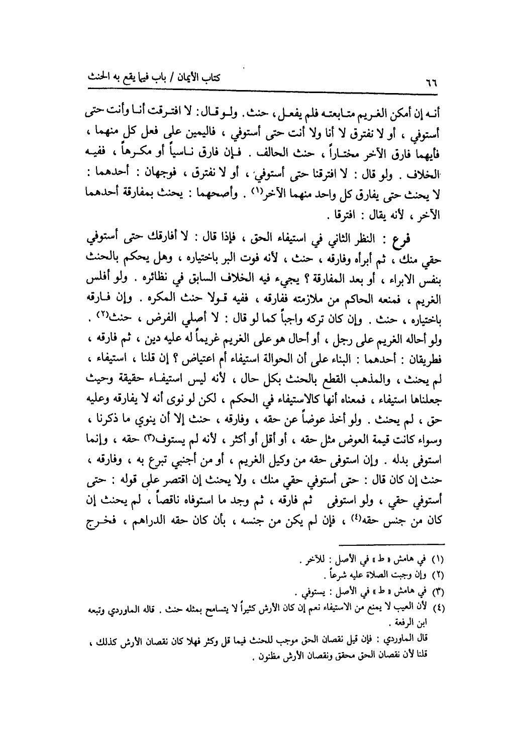 أنه إن أمكن الغريم متابعته فلم يفعل، حنث. ولو قال: لا افترقت أنا وأنت حتى أستوفي، أو لا تفترق لا أنا ولا أنت حتى أستوفي فاليمين على فعل كل منهما، فأيهما فارق الآخر مختارا، حنث الحالف. فإن فارق ناسيا أو مكرها، ففيه الخلاف. ولو قال: لا افترقنا حتى أستوفي، أو لا نفترق، فوجهان: أحدهما: لا يحنث حتى يفارق كل واحد منهما الآخر. وأصحهما: يحنث بمفارقة أحدهما الآخر، لانه يقال: افترقا. فرع النظر الثاني في استيفاء الحق، فإذا قال: لا أفارقك حتى أستوفي حقي منك، ثم أبرأه وفارقه، حنث، لانه فو ت البر باختياره، وهل يحكم بالحنث بنفس الابراء، أم بعد المفارقة ؟ يجئ فيه الخلاف السابق في نظائره. ولو أفلس الغريم، فمنعه الحاكم من ملازمته ففارقه، ففيه قولا حنث المكره. وإن فارقه باختياره، حنث. وإن كان تركه واجبا كما لو قال: لا أصلي الفرض، حنث. ولو أحاله الغريم على رجل، أو أحال هو على الغريم غريما له عليه دين، ثم فارقه، فطريقان: أحدهما: البناء على أن الحوالة استيفاء أم اعتياض ؟ إن قلنا: استيفاء، لم يحنث، والمذهب القطع بالحنث بكل حال، لانه ليس استيفاء حقيقة وحيث جعلناها استيفاء، فمعناه أنها كالاستيفاء في الحكم، لكن لو نوى أنه لا يفارقه وعليه حق، لم يحنث. ولو أخذ عوضا عن حقه، وفارقه، حنث إلا أن ينوي ما ذكرنا، وسواء كانت قيمة العوض مثل حقه، أو أقل أو أكثر، لانه لم يستوف حقه، وإنما استوى بدله. وإن استوفى حقمن وكيل الغريم، أو من أجنبي تبرع به، وفارقه، حنث إن كان قال: حتى أستوفي حقي منك، ولا يحنث إن اقتصر على قوله: حتى أستوفي حقي. ولو استوفى ثم فارقه، ثم وجد ما إستوفاه ناقصا، لم يحنث إن كان من جنس حقه، فإن لم يكن من جنسه، بأن كان حقه الدراهم، فخرج