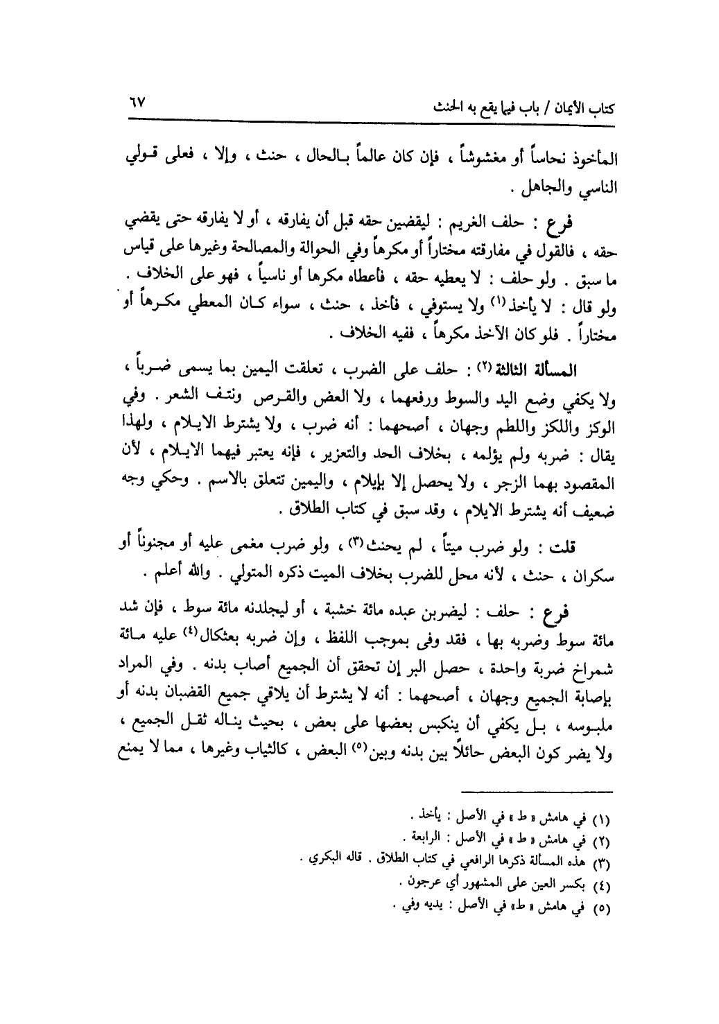 المأخوذ نحاسا أو مغشوشا، فإن كان عالما بالحال، حنث، وإلا، فعلى قولي الناسي والجاهل. فرع حلف الغريم: ليقضين حقه قبل أن يفارقه، أو لا يفارقه حتى يقضي حقه، فالقول في مفارقته مختارا أو مكرها وفي الحوالة والمصالحة وغيرها على قياس ما سبق. ولو حلف: لا يعطيه حقه، فأعطاه مكرها أو ناسيا، فهو على الخلاف. ولو قال: لا يأخذ ولا يستوفي، فأخذ، حنث، سواء كان المعطي مكرها أو مختارا. فلو كان الآخذ مكرها، ففيه الخلاف. المسألة الثالثة: حلف على الضرب، تعلقت اليمين بما يسمى ضربا، ولا يكفي وضع اليد والسوط ورفعهما، ولا العض والقرص ونتف الشعر. وفي الوكز واللكز واللطم وجهان، أصحهما: أنه ضرب، ولا يشترط الايلام، ولهذا يقال: ضربه ولم يؤلمه، بخلاف الحد والتعزير، فإنه يعتبر فيهما الايلام، لان المقصود بهما الزجر، ولا يحصل إبإيلام، واليمين تتعلق بالاسم. وحكي وجه ضعيف أنه يشترط الايلام، وقد سبق فكتاب الطلاق. قلت: ولو ضرب ميتا، لم يحنث، ولو ضرب مغمى عليه أو مجنونا أو سكران، حنث، لانه محل للضرب بخلاف الميت ذكره المتولي. والله أعلم. فرع حلف: ليضربن عبده مائة خشبة، أو ليجلدنه مائة سوط، فإن شد مائة سوط وضربه بها، فقد وفى بموجب اللفظ، وإن ضربه بعثكال عليه مائة شمراخ ضربة واحدة، حصل البر إن تحقق أن الجميع أصاب بدنه. وفي المراد بإصابة الجميع وجهان، أصحهما: أنه لا يشترط أن يلاقي جميع القضبان بدنه أو ملبوسه، بل يكفي أن ينكبس بعضها على بعض، بحيث يناله ثقل الجميع، ولا يضر كون البعض حائلا بين بدنه وبين البعض، كالثياب وغيرها، مما لا يمنع