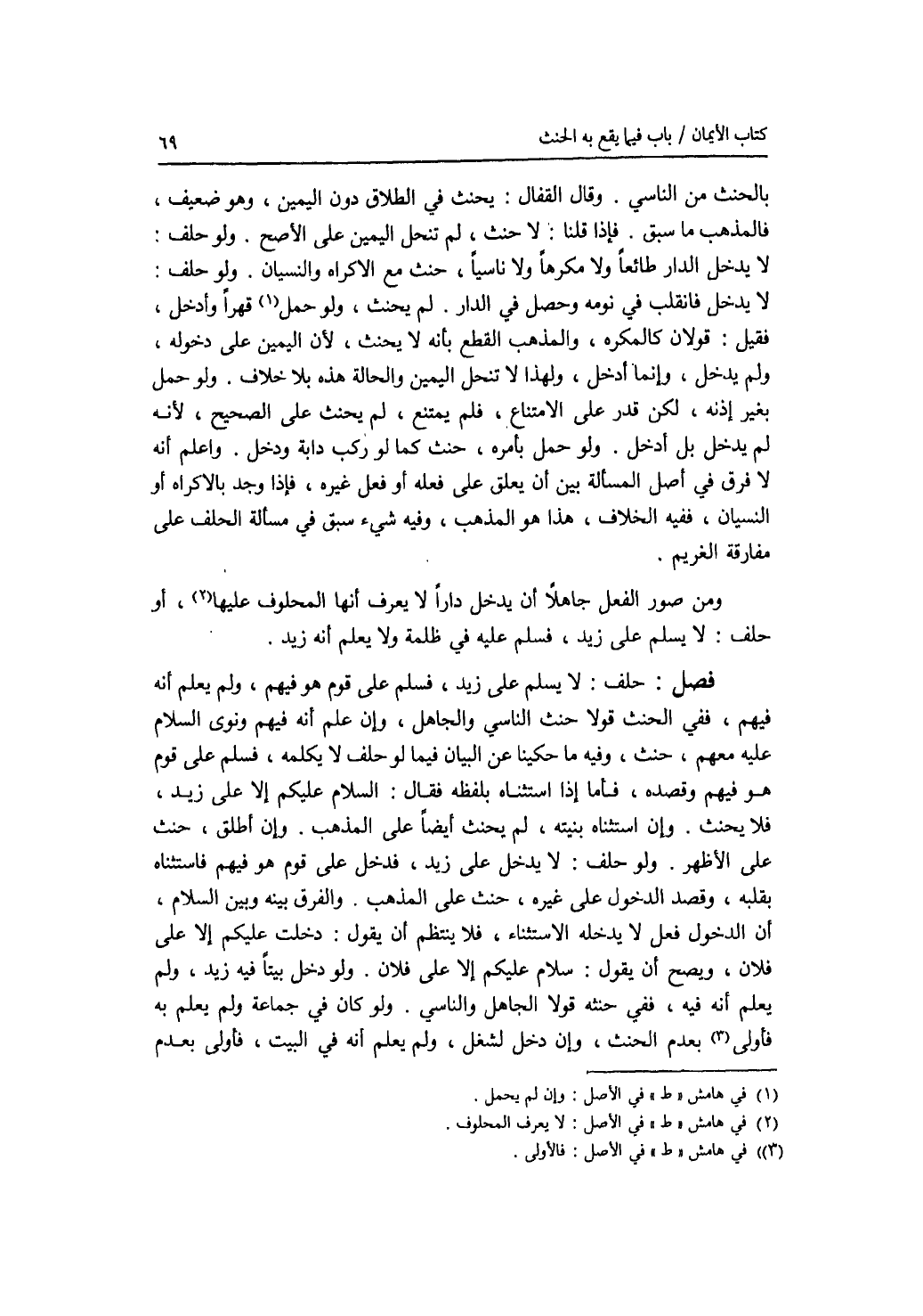 بالحنث من الناسي. وقال القفال: يحنث في الطلاق دون اليمين، وهو ضعيف، فالمذهب ما سبق. فإذا قلنا: لا حنث، لمتنحل اليمين على الاصح. ولو حلف: لا يدخل الدار طائعا ولا مكرها ولا ناسيا، حنث مع الاكراه والنسيان. ولو حلف: لا يدخل فانقلب ب في نومه وحصل في الدار، لم يحنث، ولو حمل قهرا وأدخل، فقيل: قولان كالمكره والمذهب القطع بأنه لا يحنث، لان اليمين على دخوله، ولم يدخل، وإنما أدخل، ولهذا لا تنحل اليمين والحالة هذه بلا خلاف. ولو حمل بغير إذنه، لكن قدر على الامتناع، فلم يمتنع، لم يحنث على الصحيح، لانه لم يدخل بل أدخل. ولو حمل بأمره. حنث كما لو ركب دابة ودخل. واعلم أنه لا فرق في أصل المسألة بين أن يعلق على فعله أو فعل غيره، فإذا وجد بالاكراه أو النسيان، ففيه الخلاف، هذا هو المذهب، وفيه شئ سبق في مسألة الحلف على مفارقة الغريم. ومن صور الفعل جاهلا أن يدخل دارا لا يعرف أنها المحلوف عليها، أو حلف: لا يسلم على زيد، فسلم عليه في ظلمة ولا يعلم أنه زيد. فصل حلف: لا يسلم على زيد، فسلم على قوم هو فيهم، ولم يعلم أنه فيهم، ففي الحنث قولا حنث الناسي والجاهل، وإن علم أنه فيهم ونوى السلام عليه معهم، حنث، وفيه ما حكينا عن البيان فيما لو حلف لا يكلمه، فسلم على قوم هو فيهم وقصده، فأما إستثناه بلفظه فقال: السلام عليكم إلاعلى زيد، فلا يحنث. وإن استثناه بنيته، لم يحنث أيضا على المذهب. وإن أطلق، حنث على الاظهر. ولو حلف: لا يدخل على زيد، فدخل على قوم هو فيهم فاستثنا بقلبه، وقصد الدخول على غيره، حنث على المذهب. والفرق بينه وبين السلام، أن الدخول فعل لا يدخله الاستثناء، فلا ينتظم أن يقول: دخلت عليكم إلا على فلان، ويصح أن يقول: سلام عليكم إلا على فلان. ولو دخل بيتا فيه زيد، ولم يعلم أنه فيه، ففي حنثه قولا الجاهل والناسي. ولو كان في جماعة ولم يعلم به فأولى بعدم الحنث، وإن دخل لشغل، ولم يعلم أنه في البيت، فأولى بعدم