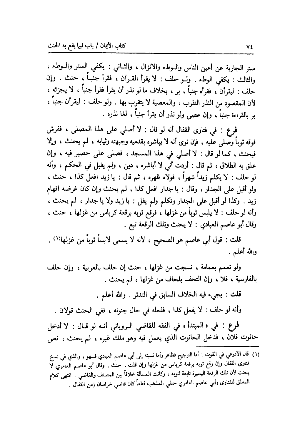 ستر الجارية عن أعين الناس والوطئ والانزال، والثاني: يكفي الستر والوطئ، والثالث: يكفي الوطئ. ولو حلف: لا يقرأ القرآن، فقرأ جنبا، حنث. وإن حلف: ليقرأن، فقرأه جنبا، بر، بخلاف ما لو نذر أن يقرأ فقرأ جنبا، لا يجزئه، لان المقصود من النذر التقرب، والمعصية لا يتقرب بها. ولو حلف: ليقرأن جنبا، بر بالقراءة جنبا، وإن عصى ولو نذر أن يقرأ جنبا، لغا نذره. فرع في فتاوى القفال أنه لو قال: لا أصلي على هذا المصلى، ففرش فوقه ثوبا وصلى عليه، فإن نوى أنه لا يباشره بقدميه وجبهته وثيابه، لم يحنث، وإلا فيحنث، كما لو قال: لا أصلي في هذا المسجد، فصلى على حصير فيه، وإن علق به الطلاق، ثم قال: أردت أني لا أباشره، دين، ولم يقبل في الحكم، وأنه لو حلف: لا يكلم زيدا شهرا، فولاه ظهره، ثم قال: يا زيد إفعل كذا، حنث، ولو أقبل على الجدار، وقال: يا جدار إفعل كذا، لم يحنث وإن كان غرضه إفهام زيد. وكذا لو أقبل على الجدار وتكلم ولم يقل: يا زيد ولا يا جدار، لم يحنث، وأنه لو حلف: لا يلبس ثوبا من غزلها، فرقع ثوبه برقعة كرباس من غزلها، حنث، وقال أبو عاصم العبادي: لا يحنث وتلك الرقعة تبع. قلت: قول أبي عاصم هو الصحيح، لانه لا يسمى لابسا ثوبا من غزلها. والله أعلم. ولو تعمم بعمامة، نسجت من غزلها، حنث إن حلف بالعربية، وإن حلف بالفارسية، فلا، وإن التحف بلحاف من غزلها، لم يحنث. قلت: يجئ فيه الخلاف السابق في التدثر. والله أعلم. وأنه لو حلف: لآ يفعل كذا، ففعله في حال جنونه، ففي الحنث قولان. فرع في المبتدأ في الفقه للقاضي الروياني أنه لو قال: لا أدخل حانوت فلان، فدخل الحانوت الذي يعمل فيه وهو ملك غيره، لم يحنث، نص