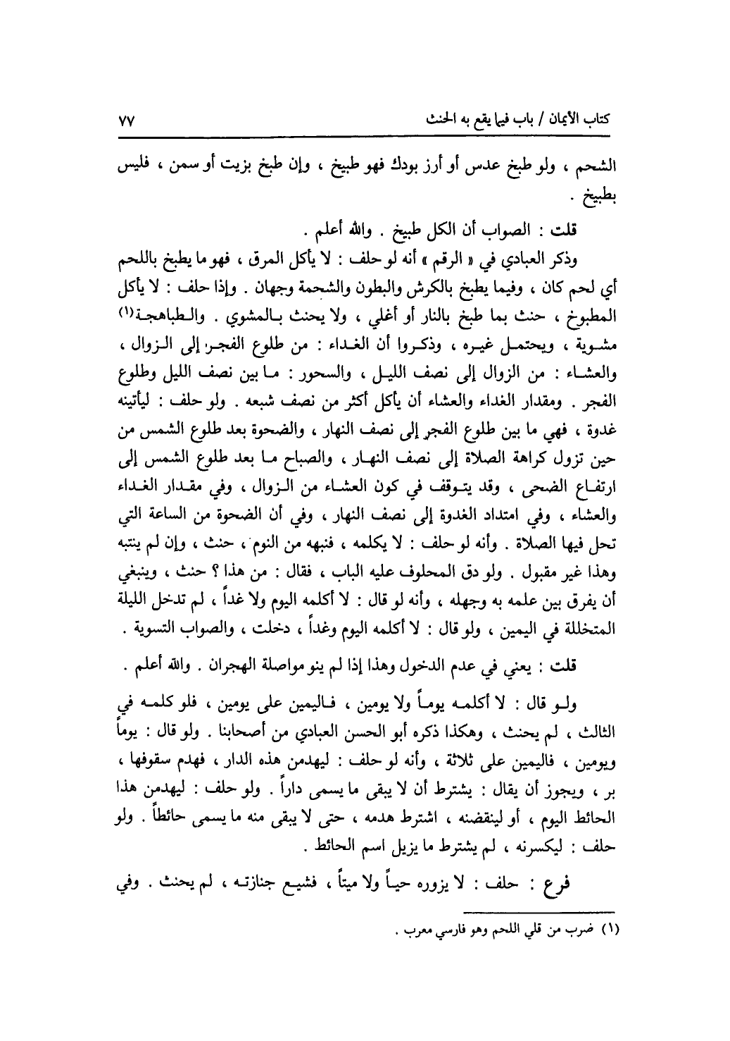 الشحم، ولو طبخ عدس أو أرز بودك فهو طبيخ، وإن طبخ بزيت أو سمن، فليس بطبيخ. قلت: الصواب أن الكل طبيخ. والله أعلم. وذكر العبادي في الرقم أنه لو حلف: لا يأكل المرق، فهو ما يطبخ باللحم أي لحم كان، وفيما يطبخ بالكرش والبطون والشحم وجهان. وإذا حلف: لا يأكل المطبوخ، حنث بما طبخ بالنار أو أغلي، ولا يحنث بالمشوي. والطباهجة مشوية، ويحتمل غيره، وذكروا أن الغداء: من طلوع الفجر إلى الزوال، والعشاء: من الزوال إلى نصف الليل، والسحور: ما بين نصف الليل وطلوع الفجر. ومقدار الغداء والعشاء أن يأكل أكثر من نصف شبعه. ولو حلف: ليأتينه غدوة، فهي ما بين طلوع الفجر إلى نصف النهار، والضحوة بعد طلوع الشمس من حين تزول كراهة الصلاة إلى نصف النهار، والصباح ما بعد طلوع الشمس إلى ارتفاع الضحى، وقد يتوقف في كون العشاء من الزوال، وفي مقدار الغداء والعشاء، وفي امتداد الغدوة إلى نصف النهار، وفي أن الضحوة من الساعة التي تحل فيها الصلاة. وأنه لو حلف: لا يكلمه، فنبهه من النوم، حنث، وإن لم ينتبه وهذا غير مقبول. ولو دق المحلوف عليه الباب، فقال: من هذا ؟ حنث، وينبغي أن يفرق بين علمه به وجهله، وأنه لو قال: لا أكلمه اليوم ولا غدا، لم تدخل الليلة المتخللة في اليمين، ولو قال: لا أكلمه اليوم وغدا، دخلت، والصواب التسوية. قلت: يعني في عدم الدخول وهذا إذا لم ينو مواصلة الهجران. والله أعلم. ولو قال: لا أكلمه يوما ولا يومين، فاليمين على يومين، فلو كلمه في الثالث، لم يحنث، وهكذا ذكره أبو الحسن العبادي من أصحابنا. ولو قال: يوما ويومين، فاليمين على ثلاثة، وأنه لو حلف: ليهدمن هذه الدار، فهدم سقوفها، بر، ويجوز أن يقال: يشترط أن لا يبقى ما يسمى دارا. ولو حلف: ليهدمن هذا الحائط اليوم، أو لينقضنه، اشترط هدمه، حتى لا يبقى منه ما يسمى حائطا. ولو حلف: ليكسرنه، لم يشترط ما يزيل اسم الحائط. فرع حلف: لا يزوره حيا ولا ميتا، فشيع جنازته، لم يحنث. وفي
