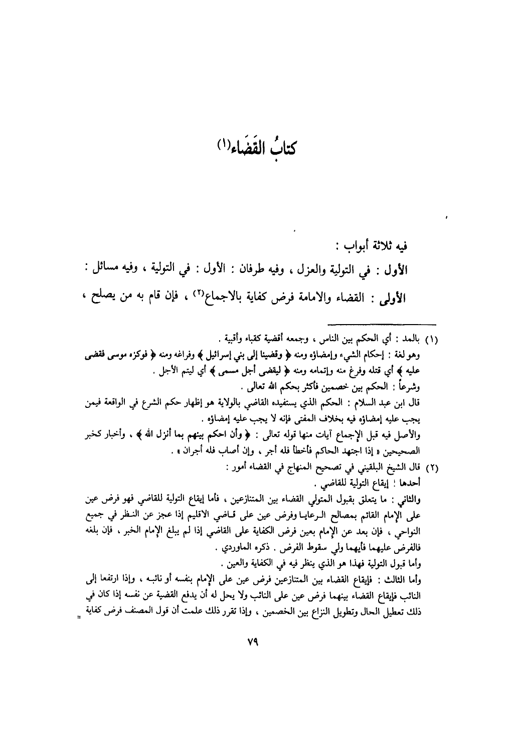 الأول : في التولية، وفيه مسائل: الاولى: القضاء والامامة فرض كفاية بالاجماع، فإن قام به من يصلح،