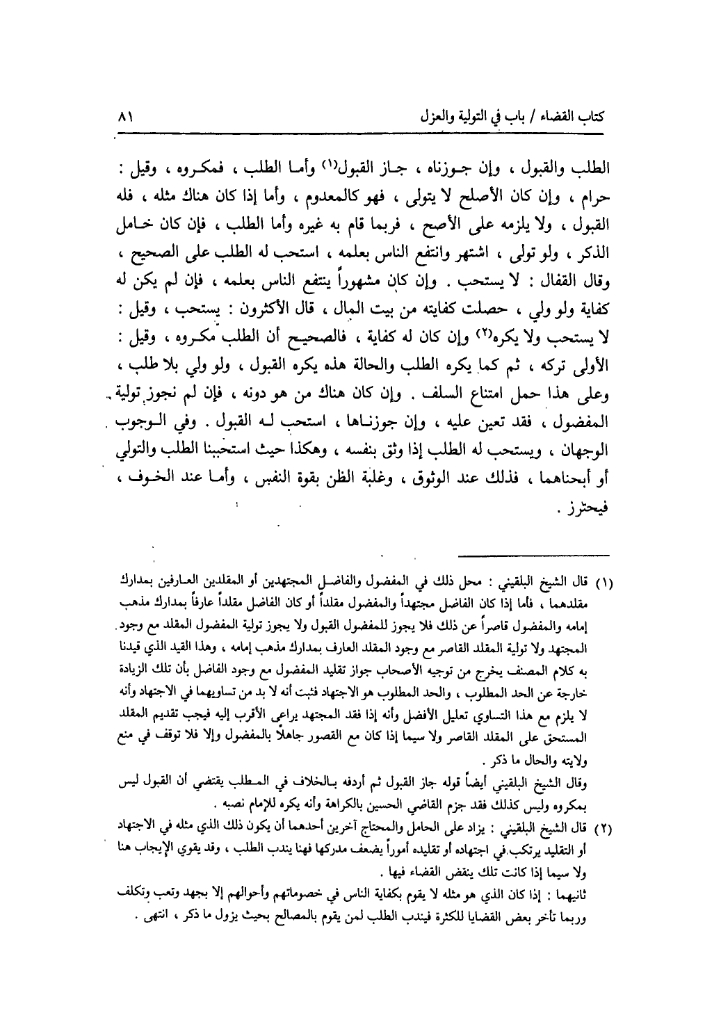 الطلب والقبول، وإن جوزناه، جاز القبول. وأما الطلب، فمكروه، وقيل: حرام، وإن كان الاصلح لا يتولى، فهو كالمعدوم، وأما إذا كان هناك مثله، فله القبول، ولا يلزمه على الاصح، فربما قام به غيره وأما الطلب، فإن كان خامل الذكر، ولو تولى، اشتهر وانتفع الناس بعلمه، استحب له الطلب على الصحيح، وقال القفال: لا يستحب. وإن كان مشهورا ينتفع الناس بعلمه، فإن لم يكن له كفاية ولو ولي، حصلت كفايته من بيت المال، قال الاكثرون: يستحب، وقيل: لا يستحب ولا يكره، وإن كان له كفاية، فالصحيح أن الطلب مكروه، وقيل: الاولى تركه، ثم كما يكره الطلب والحالة هذه يكره القبول، ولو ولي بلا طلب، وعلى هذا حمل امتناع السلف. وإن كان هناك من هو دونه، فإن لم نجوز تولية المفضول، فقد تعين عليه، وإن جوزناها، استحب له القبول. وفي الوجوب الوجهان، ويستحب له الطلب إذا وثق بنفسه، وهكذا حيث استحببنا الطلب والتولي أو أبحناهما، فذلك عند الوثوق، وغلبة الظن بقوة النفس، وأما عند الخوف، فيحترز.