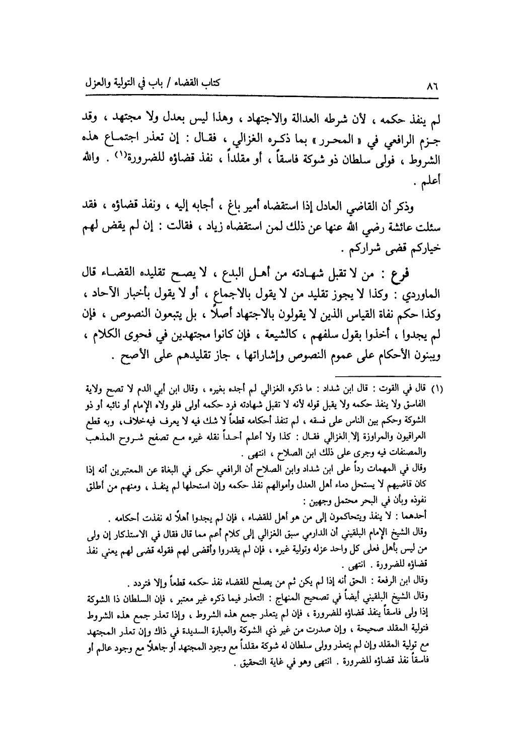 لم ينفذ حكمه، لان شرطه العدالة والاجتهاد، وهذا ليس بعدل ولا مجتهد، وقد جزم الرافعي في المحرر بما ذكره الغزالي، فقال: إن تعذر اجتماع هذه الشروط، فولى سلطان ذو شوكة فاسقا، أو مقلدا، نفذ قضاؤه للضرورة. والله أعلم. وذكر أن القاضي العادل إذا استقضاه أمير باغ، أجابه إليه، ونفذ قضاؤه، فقد سئلت عائشة رضي الله عنها عن ذلك لمن استقضاه زياد، فقالت: إن لم يقض لهم خياركم قضى شراركم. فرع من لا تقبل شهادته من أهل البدع، لا يصح تقليده القضاء قال الماوردي: وكذا لا يجوز تقليد من لا يقول بالاجماع، أو لا يقول بأخبار الآحاد، وكذا حكم نفاة القياس الذين لا يقولون بالاجتهاد أصلا، بل يتبعون النصوص، فإن لم يجدوا، أخذوا بقول سلفهم، كالشيعة، فإن كانوا مجتهدين في فحوى الكلام، ويبنون الاحكام على عموم النصوص وإشاراتها، جاز تقليدهم على الاصح.