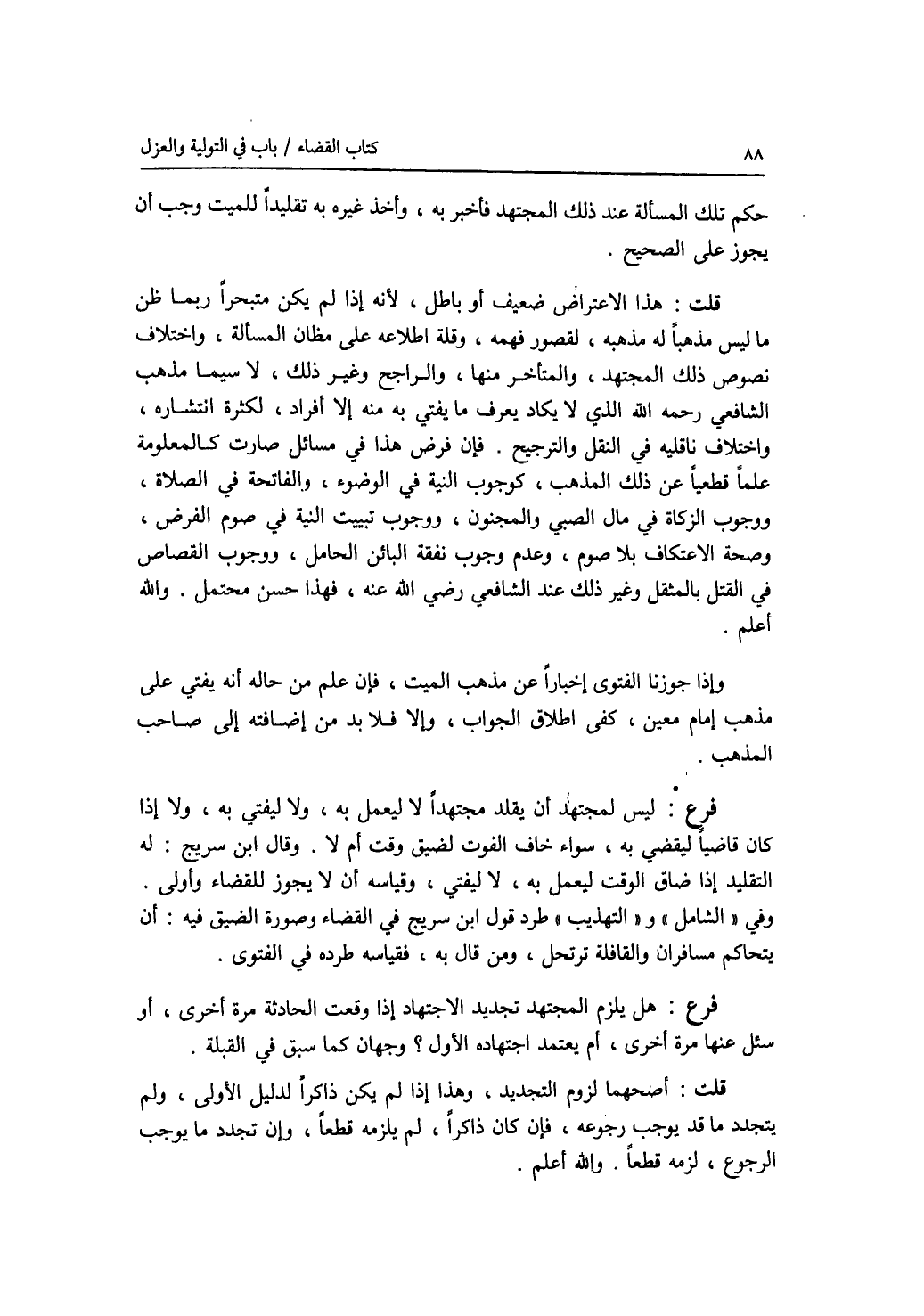 حكم تلك المسألة عند ذلك المجتهد فأخبر به، وأخذ غيره به تقليدا للميت وجب أن يجوز على الصحيح. قلت: هذا الاعتراض ضعيف أو باطل، لانه إذا لم يكن متبحرا ربما ظن ما ليس مذهبا له مذهبه، لقصور فهمه، وقلة اطلاعه على مظان المسألة، واختلاف نصوص ذلك المجتهد، والمتأخر منها، والراجح وغير ذلك، لاسيما مذهب الشافعي رحمه الله الذي لا يكاد يعرف ما يفتى به منه إلا أفراد، لكثرة انتشاره، واختلاف ناقليه في النقل والترجيح. فإن فرض هذا في مسائل صارت كالمعلومة علما قطعيا عن ذلك المذهب، كوجوب النية في الوضوء، والفاتحة في الصلاة، ووجوب الزكاة في مال الصبي والمجنون، ووجوب تبييت النية في صوم الفرض، وصحة الاعتكاف بلا صوم، وعدم وجوب نفقة البائن الحامل، ووجوب القصاص في القتل بالمثقل وغير ذلك عند الشافعي رضي الله عنه، فهذا حسن محتمل. والله أعلم. وإذا جوزنا الفتوى إخبارا عن مذهب الميت، فإن علم من حاله أنه يفتي على مذهب إمام معين، كفى إطلاق الجواب، وإلا فلا بد من إضافته إلى صاحب المذهب. فرع ليس لمجتهد أن يقلد مجتهدا لا ليعمل به، ولا ليفتي به، ولا إذا كان قاضيا ليقضي به، سواء خاف الفوت لضيق وقت أم لا. وقال ابن سريج: له التقليد إذا ضاق الوقت ليعمل به، لا ليفتي، وقياسه أن لا يجوز للقضاء وأولى. وفي الشامل والتهذيب طرد قول ابن سريج في القضاء وصورة الضيف فيه: أن يتحاكم مسافران والقافلة ترتحل، ومن قال به، فقياسه طرده في الفتوى. فرع هل يلزم المجتهد تجديد الاجتهاد إذا وقعت الحادثة مرة أخرى، أو سئل عنها مرة أخرى، أم يعتمد اجتهاده الاول ؟ وجهان كما سبق في القبلة. قلت: أصحهما لزوم التجديد، وهذا إذا لم يكن ذاكرا لدليل الاولى، ولم يتجدد ما قد يوجب رجوعه، فإن كان ذاكرا، لم يلزمه قطعا، وإن تجدد ما يوجب الرجوع، لزمه قطعا. والله أعلم.