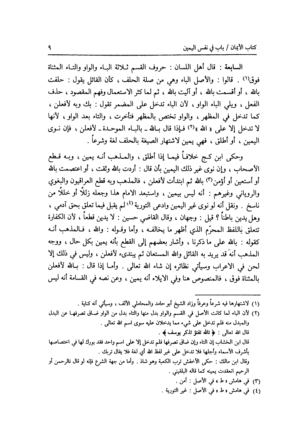 السابعة: قال أهل اللسان: حروف القسم ثلاثة الباء والواو والتاء المثناة فوق، قالوا: والاصل الباء وهي من صلة الحلف، كأن القائل يقول: حلفت بالله، أو أقسمت بالله، أو آليت بالله، ثم لما كثر الاستعمال وفهم المقصود، حذف الفعل، ويلي الباء الواو، لان الباء تدخل على المضمر تقول: بك وبه لافعلن، كما تدخل في المظهر، والواو تختص بالمظهر فتأخرت، والتاء بعد الواو، لانها لا تدخل إلا على الله، فإذا قال بالله - بالباء الموحدة - لافعلن، فإن نوى اليمين، أو أطلق، فهي يمين لاشتهار الصبغة بالحلف لغة وشرعا. وحكى ابن كج خلافا فيما إذا أطلق، والمذهب أنه يمين، وبه قطع الاصحاب، وإن نوى غير ذلك اليمين بأن قال: أردت بالله وثقت، أو اعتصمت بالله أو أستعين أو أؤمن بالله ثم ابتدأت لافعلن، فالمذهب وبه قطع العراقيون والبغوي والروياني وغيرهم: أنه ليس بيمين، واستبعد الامام هذا وجعله زللا أو خللا من ناسخ. ونقل أنه لو نوى غير اليمين وادعى التورية لم يقيل فيما تعلق بحق ادمي، وهل يدين باطنا ؟ قبل: وجهان، وقال القاضي حسين: لا يدين قطعا، لان الكفارة تتعلق باللفظ المحرم الذي أظهر ما يخالفه، وأما قوله: والله، فالمذهب أنه كقوله: بالله على ما ذكرنا، وأشار بعضهم إلى القطع بأنه يمين بكل حال، ووجه المذهب أنه قد يريد به القائل والله المستعان ثم يبتدئ لافعلن، وليس في ذلك إلا لحن في الاعراب وسيأتي نظائره إن شاء الله تعالى. وأما إذا قال: تالله لافعلن بالمثناة فوق، فالمنصوص هنا وفي الايلاء أنه يمين، وعن نصه في القسامة أنه ليس