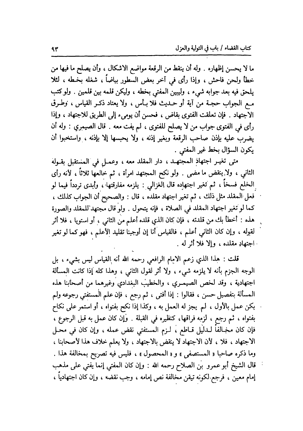 ما لا يحسن إظهاره. وله أن ينقط من الرقعة مواضع الاشكال، وأن يصلح ما فيها من خطأ ولحن فاحش، وإذا رأى في آخر بعض السطور بياضا، شغله بخطه، لئلا يلحق فيه بعد جوابه شئ، وليبين المفتي بخطه، وليكن قلمه بين قلمين. ولو كتب مع الجواب حجة من آية أو حديث فلا بأس، ولا يعتاد ذكر القياس، وطرق الاجتهاد. فإن تعلقت الفتوى بقاض، فحسن أن يومئ إلى الطريق للاجتهاد، وإذا رأى في الفتوى جواب من لا يصلح للفتوى، لم يفت معه. قال الصيمري: وله أن يضرب عليه بإذن صاحب الرقعة وبغير إذنه، ولا يحبسها إلا بإذنه، واستحبوا أن يكون السؤال بخط غير المفتي. فرع متى تغير اجتهاد المجتهد، دار المقلد معه، وعمل في المستقبل بقوله الثاني، ولا ينقض ما مضى، ولو نكح المجتهد امرأة، ثم خالعها ثلاثا، لانه رأى الخلع فسخا، ثم تغير اجتهاده قال الغزالي: يلزمه مفارقتها، وأبدى ترددا فيما لو فعل المقلد مثل ذلك، ثم تغير اجتهاد مقلده، قال: والصحيح أن الجواب كذلك، كما لو تغير اجتهاد المقلد في الصلاة، فإنه يتحول. ولو قال مجتهد للمقلد والصورة هذه: أخطأ بك من قلدته، فإن كان الذي قلده أعلم من الثاني، أو استويا، فلا أثر لقوله، وإن كان الثاني أعلم، فالقياس أنا إن أوجبنا تقليد الاعلم، فهو كما لو تغير اجتهاد مقلده، وإلا فلا أثر له. قلت: هذا الذي زعم الامام الرافعي رحمه الله أنه القياس ليس بشئ، بل الوجه الجزم بأنه لا يلزمه شئ، ولا أثر لقول الثاني، وهذا كله إذا كانت المسألة اجتهادية، وقد لخص الصيمري، والخطيب البغدادي وغيرهما من أصحابنا هذه المسألة بتفصيل حسن، فقالوا: إذا أفتى، ثم رجع، فإن علم المستفتي رجوعه ولم يكن عمل بالاول لم يجز له العمل به، وكذا إذا نكح بفتواه، أو استمر على نكاح بفتواه، ثم رجع، لزمه فراقها، كنظيره في القبلة. وإن كان عمل به قبل الرجوع، فإن كان مخالفا لدليل قاطع، لزم المستفتي نقض عمله، وإن كان في محل الاجتهاد، فلا، لان الاجتهاد لا ينقض بالاجتهاد، ولا يعمل خلاف هذا لاصحابنا، وما ذكره صاحبا المستصفى والمحصول، فليس فيه تصريح بمخالفة هذا. قال الشيخ أبو عمرو ابن الصلاح رحمه الله: وإن كان المفتي إنما يفتي على مذهب إمام معين، فرجع لكونه تيقن مخالفة نص إمامه، وجب نقضه، وإن كان اجتهاديا،