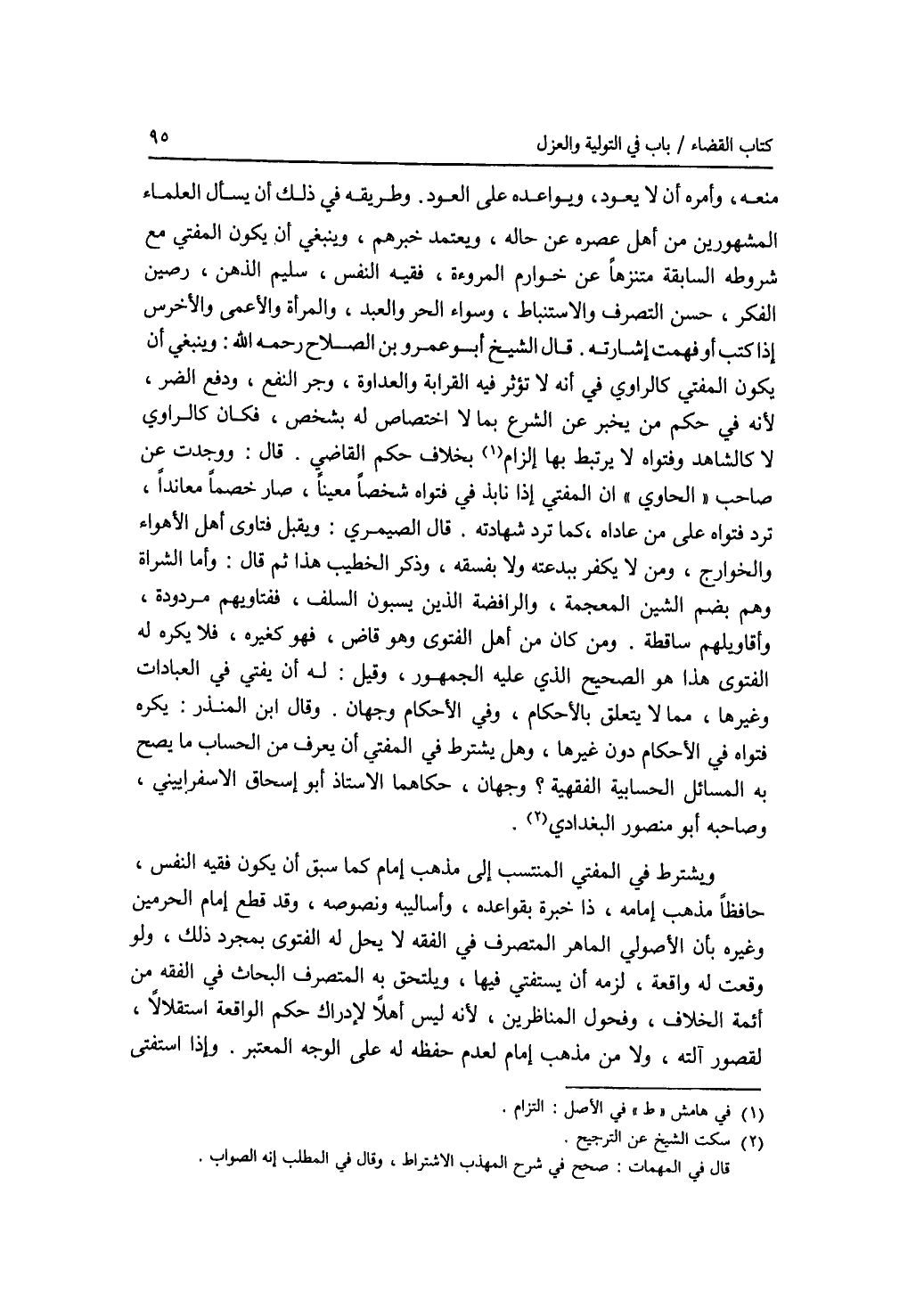 منعه، وأمره أن لا يعود، ويواعده على العود، وطريقه في ذلك أن يسأل العلماء المشهورين من أهل عصره عن حاله، ويعتمد خبرهم، وينبغي أن يكون المفتي مع شروطه السابقة متنزها عن خوارم المروءة، فقيه النفس، سليم الذهن، رصين الفكر، حسن التصرف والاستنباط، وسواء الحر والعبد، والمرأة والاعمى والاخرس إذا كتب أو فهمت إشارته. قال الشيخ أبو عمرو بن الصلاح رحمه الله: وينبغي أن يكون المفتي كالراوي في أنه لا تؤثر فيه القرابة والعداوة، وجر النفع، ودفع الضر، لانه في حكم من يخبر عن الشرع بما لا اختصاص له بشخص، فكان كالراوي لا كالشاهد وفتواه لا يرتبط بها إلزام بخلاف حكم القاضي. قال: ووجدت عن صاحب الحاوي إن المفتي إذا نابذ في فتواه شخصا معينا، صار خصما معاندا، ترد فتواه على من عاداه، كما ترد شهادته. قال الصيمري: ويقبل فتاوى أهل الاهواء والخوارج، ومن لا يكفر ببدعته ولا بفسقه، وذكر الخطيب هذا ثم قال: وأما الشراة وهم بضم الشين المعجمة، والرافضة الذين يسبون السلف، ففتاويهم مردودة، وأقاويلهم ساقطة. ومن كان من أهل الفتوى وهو قاض، فهو كغيره، فلا يكره له الفتوى هذا هو الصحيح الذي عليه الجمهور، وقيل: له أن يفتي في العبادات وغيرها، مما لا يتعلق بالاحكام، وفي الاحكام وجهان. وقال ابن المنذر: يكره فتواه في الاحكام دون غيرها، وهل يشترط في المفتي أن يعرف من الحساب ما يصح به المسائل الحسابية الفقهية ؟ وجهان، حكاهما الاستاذ أبو إسحق الاسفراييني، وصاحبه ويشترط في المفتي المنتسب إلى مذهب إمام كما سبق أن أبو منصور البغدادي يكون فقيه النفس، حافظا مذهب إمامه، ذا خبرة بقواعده، وأساليبه ونصوصه، وقد قطع إمام الحرمين وغيره بأن الاصولي الماهر المتصرف في الفقه لا يحل له الفتوى بمجرد ذلك، ولو وقعت له واقعة، لزمه أن يستفتي فيها، ويلتحق به المتصرف البحاث في الفقه من أئمة الخلاف، وفحول المناظرين، لانه ليس أهلا لادراك حكم الواقعة استقلالا، لقصور آلته، ولا من مذهب إمام لعدم حفظه له على الوجه المعتبر. وإذا استفتى