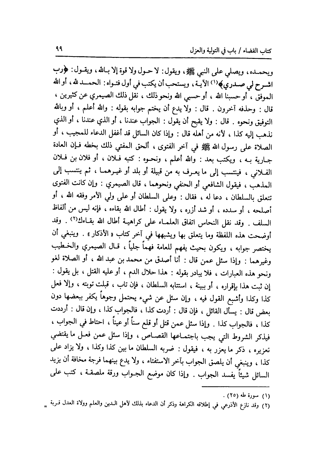 ويحمده، ويصلي على النبي - صلى الله عليه وسلم -، ويقول: لا حول ولا قوة إلا بالله، ويقول: رب اشرح لي صدري الآية، ويستحب أن يكتب في أول فتواه: الحمد لله، أو الله الموفق، أو حسبنا الله، أو حسبي الله ونحو ذلك، نقل ذلك الصيمري عن كثيرين، قال: وحذفه آخرون. قال: ولا يدع أن يختم جوابه بقوله: والله أعلم، أو وبالله التوفيق ونحوه. قال: ولا يقبح أن يقول: الجواب عندنا، أو الذي عندنا، أو الذي نذهب إليه كذا، لانه من أهله قال: وإذا كان السائل قد أغفل الدعاء للمجيب، أو الصلاة على رسول الله - صلى الله عليه وسلم - في آخر الفتوى، ألحق المفتي ذلك بخطه فإن العادة جارية به، ويكتب بعد: والله أعلم، ونحوه: كتبه فلان، أو فلان بن فلان الفلاني، فينتسب إلى ما يعرف به من قبيلة أو بلد أو غيرهما، ثم ينتسب إلى المذهب، فيقول الشافعي أو الحنفي ونحوهما، قال الصيمري: وإن كانت الفتوى تتعلق بالسلطان، دعا له، فقال: وعلى السلطان أو على ولي الامر وفقه الله، أو أصلحه، أو سدده، أو شد أزره، ولا يقول: أطال الله بقاءه، فإنه ليس من ألفاظ السلف. وقد نقل النحاس اتفاق العلماء على كراهية أطال الله بقاءك. وقد أوضحت هذه اللفظة وما يتعلق بها ويشبهها في آخر كتاب الاذكار. وينبغي أن يختصر جوابه، ويكون بحيث يفهم للعامة فهما جليا، قال الصيمري والخطيب وغيرهما: وإذا سئل عمن قال: أنا أصدق من محمد بن عبد الله، أو الصلاة لغو ونحو هذه العبارات، فلا يبادر بقوله: هذا حلال الدم، أو عليه القتل، بل يقول: إن ثبت هذا بإقراره، أو ببينة، استتابه السلطان، فإن تاب، قبلت توبته، وإلا فعل كذا وكذا وأشبع القول فيه، وإن سئل عن شئ يحتمل وجوها يكفر ببعضها دون بعض قال: يسأل القائل، فإن قال: أردت كذا، فالجواب كذا، وإن قال: أرددت كذا، فالجواب كذا. وإذا سئل عمن قتل أو قلع سنا أو عينا، احتاط في الجواب، فيذكر الشروط التي يجب باجتماعها القصاص، وإذا سئل عمن فعل ما يقتضي تعزيره، ذكر ما يعزر به، فيقول: ضربه السلطان ما بين كذا وكذا، ولا يزاد على كذا، وينبغي أن يلصق الجواب بآخر الاستفتاء، ولا يدع بينهما فرجة مخافة أن يزيد السائل شيئا يفسد الجواب. وإذا كان موضع الجواب ورقة ملصفة، كتب على
