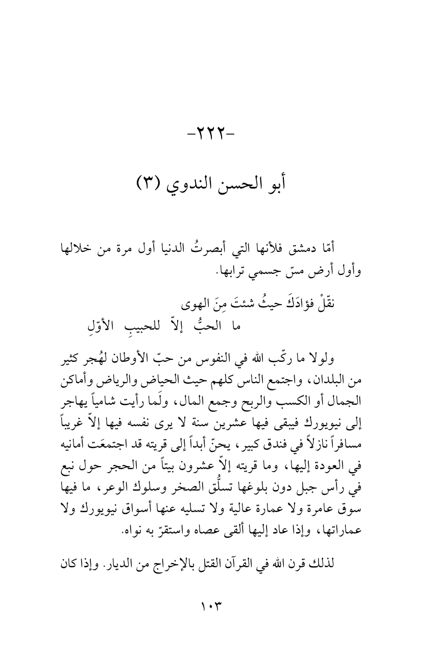 ولولا ما ركّب الله في النفوس من حبّ الأوطان لهُجر كثير من البلدان، واجتمع الناس كلهم حيث الحياض والرياض وأماكن الجمال أو الكسب والربح وجمع المال، ولَما رأيت شامياً يهاجر إلى نيويورك فيبقى فيها عشرين سنة لا يرى نفسه فيها إلاّ غريباً مسافراً نازلاً في فندق كبير، يحنّ أبداً إلى قريته قد اجتمعَت أمانيه في العودة إليها، وما قريته إلاّ عشرون بيتاً من الحجر حول نبع في رأس جبل دون بلوغها تسلُّق الصخر وسلوك الوعر، ما فيها سوق عامرة ولا عمارة عالية ولا تسليه عنها أسواق نيويورك ولا عماراتها، وإذا عاد إليها ألقى عصاه واستقرّ به نواه.
