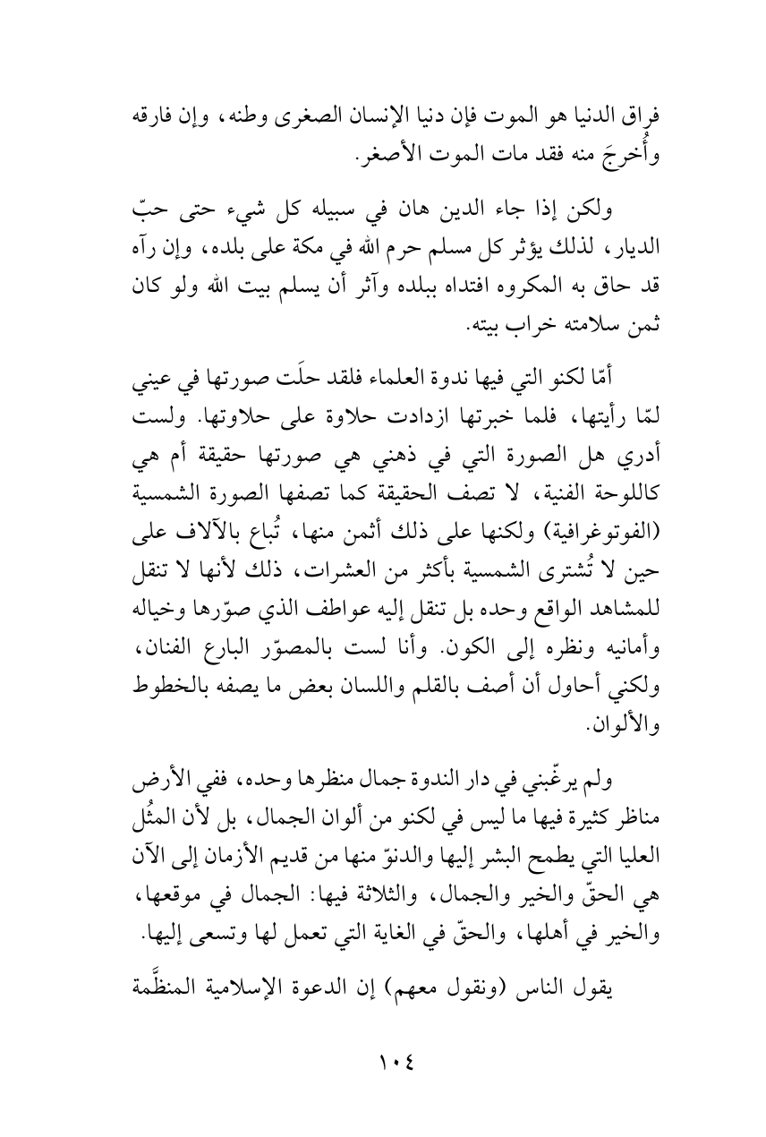 ولم يرغّبني في دار الندوة جمال منظرها وحده، ففي الأرض مناظر كثيرة فيها ما ليس في لكنو من ألوان الجمال، بل لأن المثُل العليا التي يطمح البشر إليها والدنوّ منها من قديم الأزمان إلى الآن هي الحقّ والخير والجمال، والثلاثة فيها: الجمال في موقعها، والخير في أهلها، والحقّ في الغاية التي تعمل لها وتسعى إليها.
