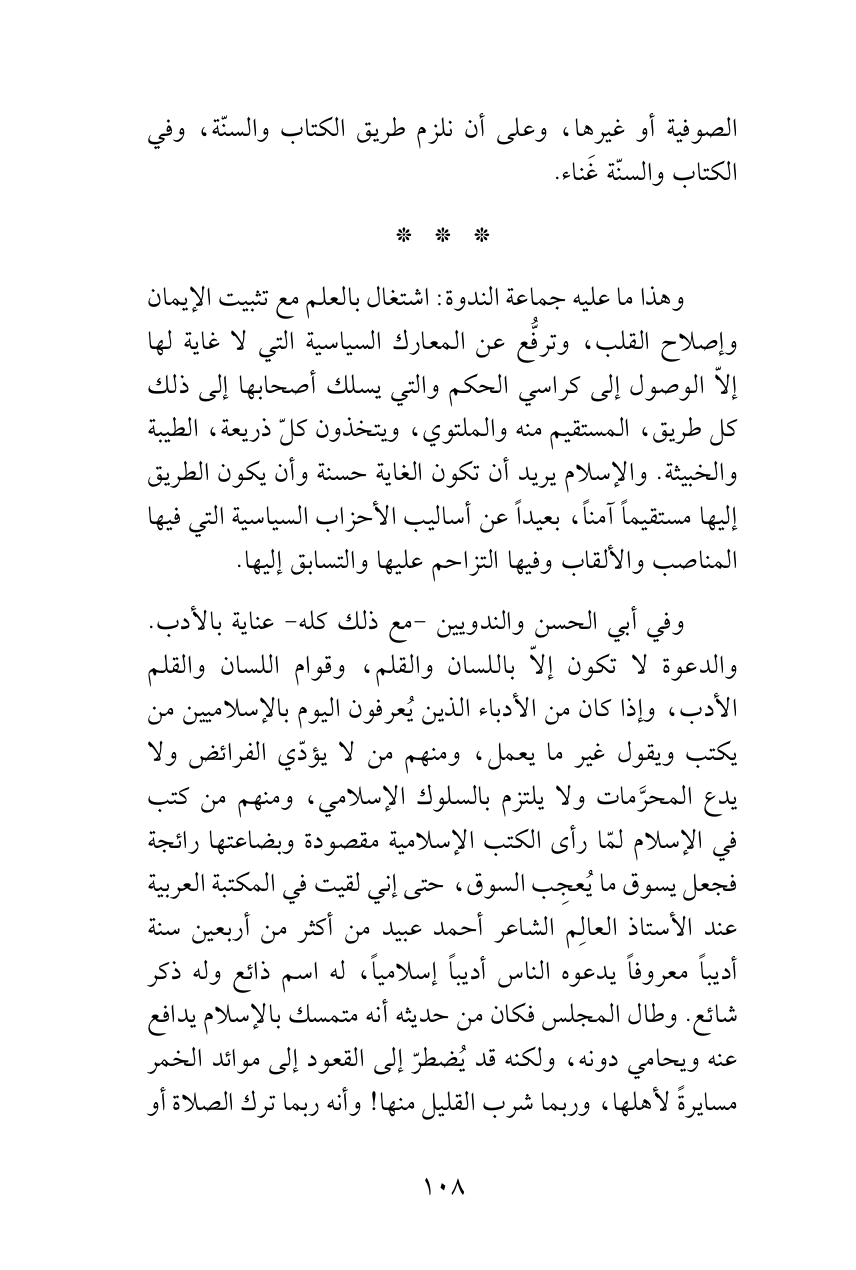 وفي أبي الحسن والندويين -مع ذلك كله- عناية بالأدب. والدعوة لا تكون إلاّ باللسان والقلم، وقوام اللسان والقلم الأدب، وإذا كان من الأدباء الذين يُعرفون اليوم بالإسلاميين من يكتب ويقول غير ما يعمل، ومنهم من لا يؤدّي الفرائض ولا يدع المحرَّمات ولا يلتزم بالسلوك الإسلامي، ومنهم من كتب في الإسلام لمّا رأى الكتب الإسلامية مقصودة وبضاعتها رائجة فجعل يسوق ما يُعجِب السوق، حتى إني لقيت في المكتبة العربية عند الأستاذ العالِم الشاعر أحمد عبيد من أكثر من أربعين سنة أديباً معروفاً يدعوه الناس أديباً إسلامياً، له اسم ذائع وله ذكر شائع. وطال المجلس فكان من حديثه أنه متمسك بالإسلام يدافع عنه ويحامي دونه، ولكنه قد يُضطرّ إلى القعود إلى موائد الخمر مسايرةً لأهلها، وربما شرب القليل منها! وأنه ربما ترك الصلاة أو